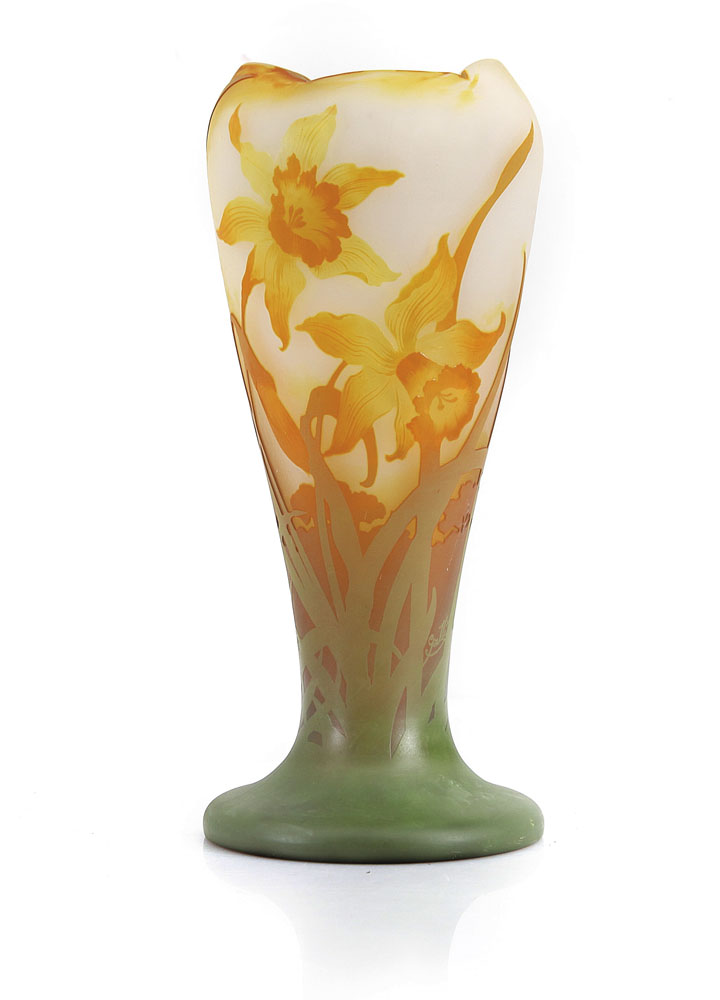 VASO IN VETRO TRIPLO, GALLE', 1900 CA., a balaustro con collo polilobato, decoro di giunchiglie e foglie inciso ad acido nei toni dell'arancio e del verde su fondo sfumato giallo, firma in rilievo a cammeo "Gallé".