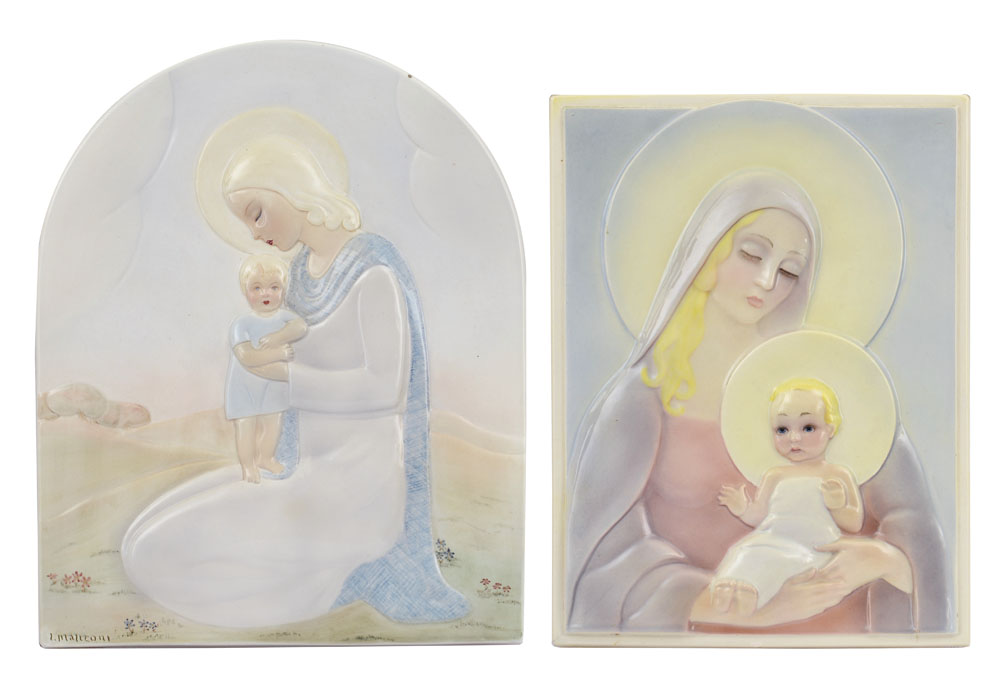 DUE PLACCHE IN CERAMICA, ESSEVI E LE BERTETTI, TORINO, ANNI '40 E '50, rettangolare con Madonna con Bambino, fessura; e centinata con Madonna con Bambino, firma su fronte L.Manzoni.