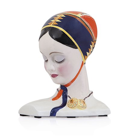 BUSTO DI RAGAZZA IN CERAMICA, ESSEVI, ANNI '30, policromo; firma "ESSEVI CAGLIARI MOD.DI.MOLA L.C." e "N.111" sul fondo.