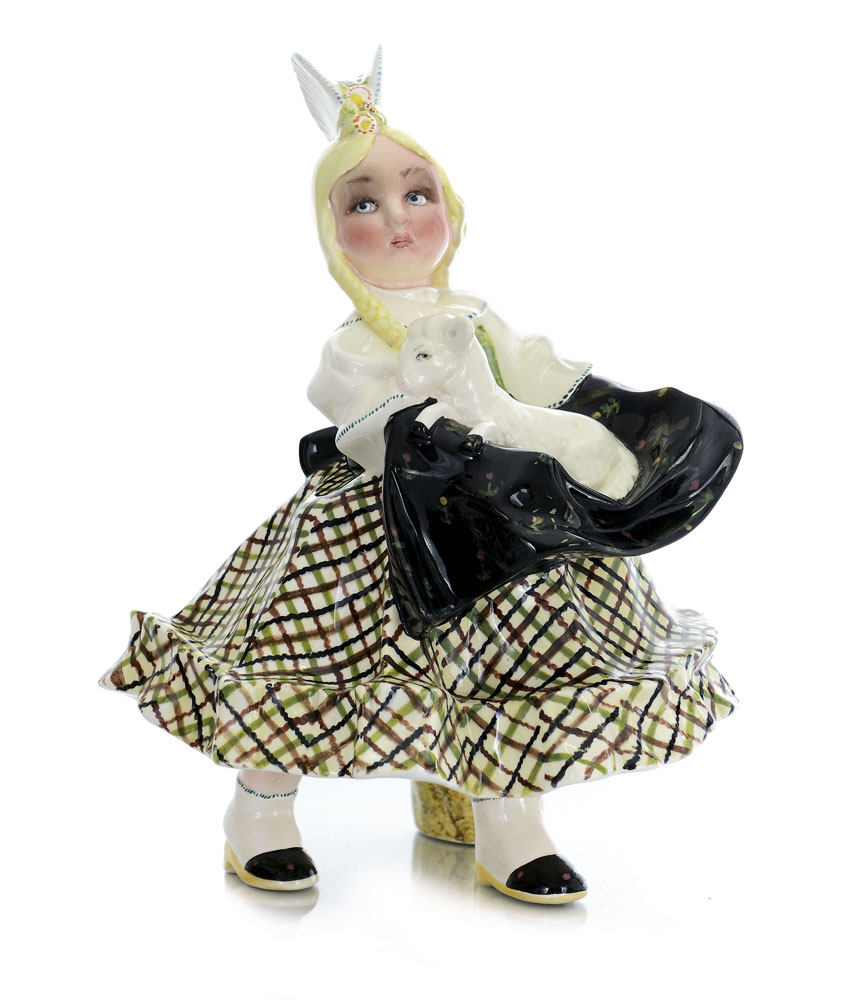 GRUPPO IN CERAMICA, ESSEVI DI SANDRO VACCHETTI, 1940 CA., raffigurante bambina con agnellino; decoro policromo.