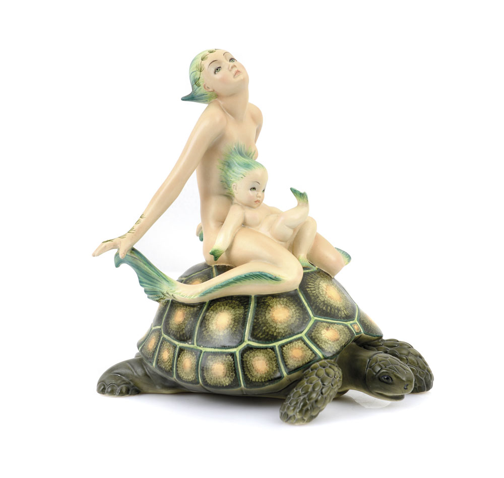 GRUPPO "MAMMA SIRENA" IN CERAMICA, LENCI, HELEN KONIG SCAVINI, 1936 CA., decoro policromo; lieve rincollo alla coda e qualche mancanza alle dita.