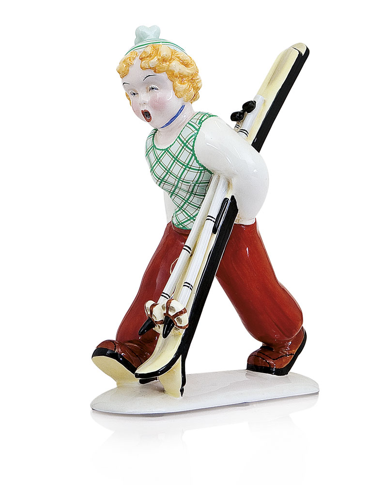 TOSIN FIGURA DI BAMBINO SCIATORE IN CERAMICA, T.TOSIN, ANNI '60, policromo;...