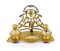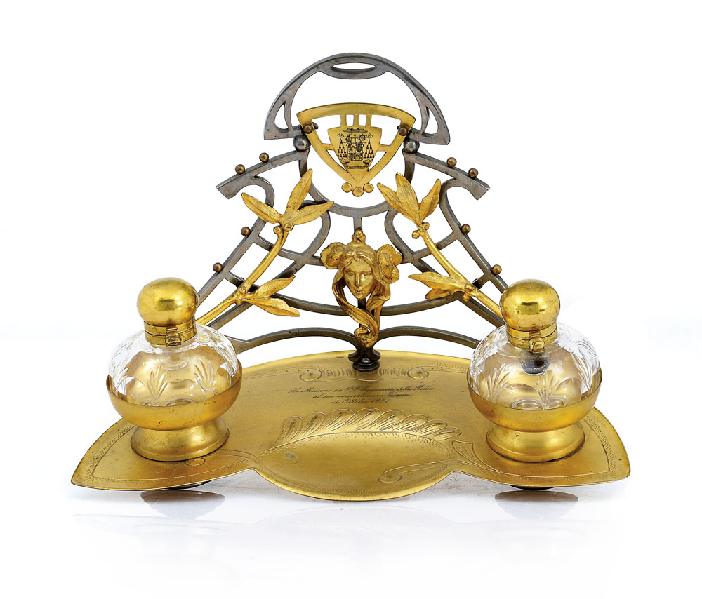 CALAMAIO LIBERTY IN METALLO DORATO E BRUNITO, INIZIO XX SECOLO, fregio traforato centrato da volto muliebre entro rami d'ulivo, doppia ampolla in vetro, iscrizione incisa datata 1908.