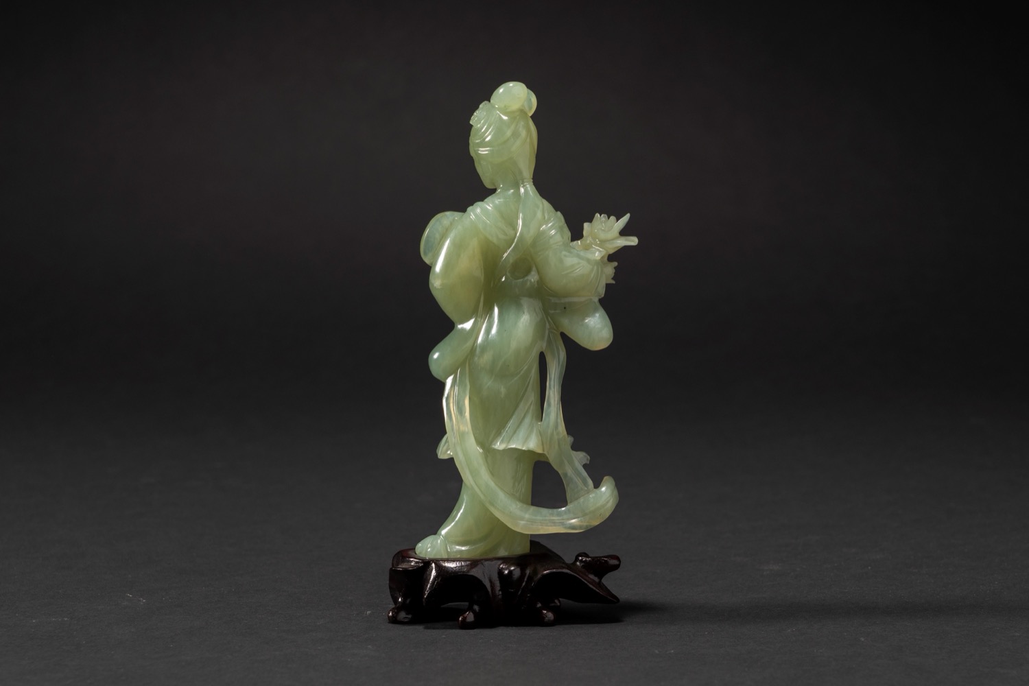 浅绿色翡翠雕观音像,中国,二十世纪a tutto tondo, la figura stante tiene in mano un fiore di loto, avvolta in ampi panneggi mossi dal vento, su base separata in legno duro sagomato.