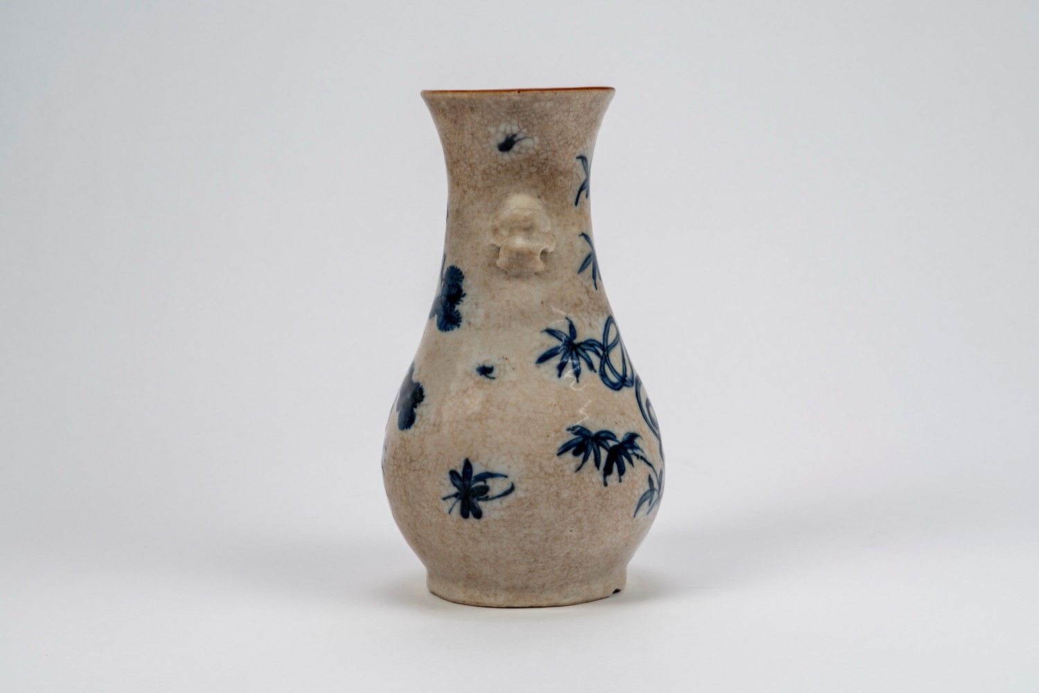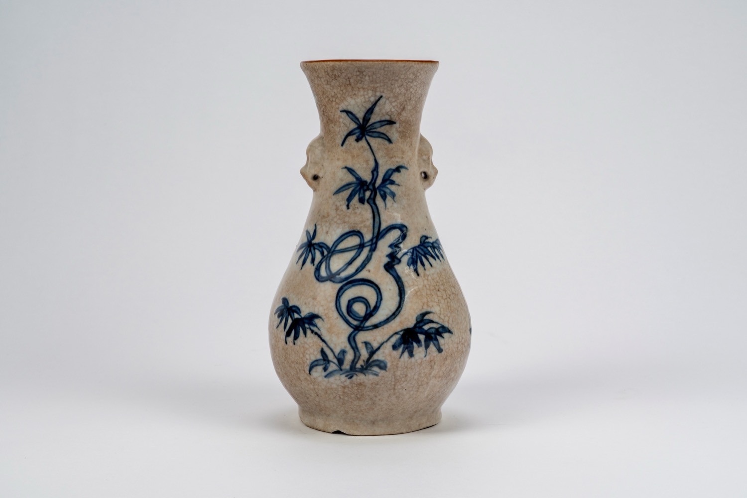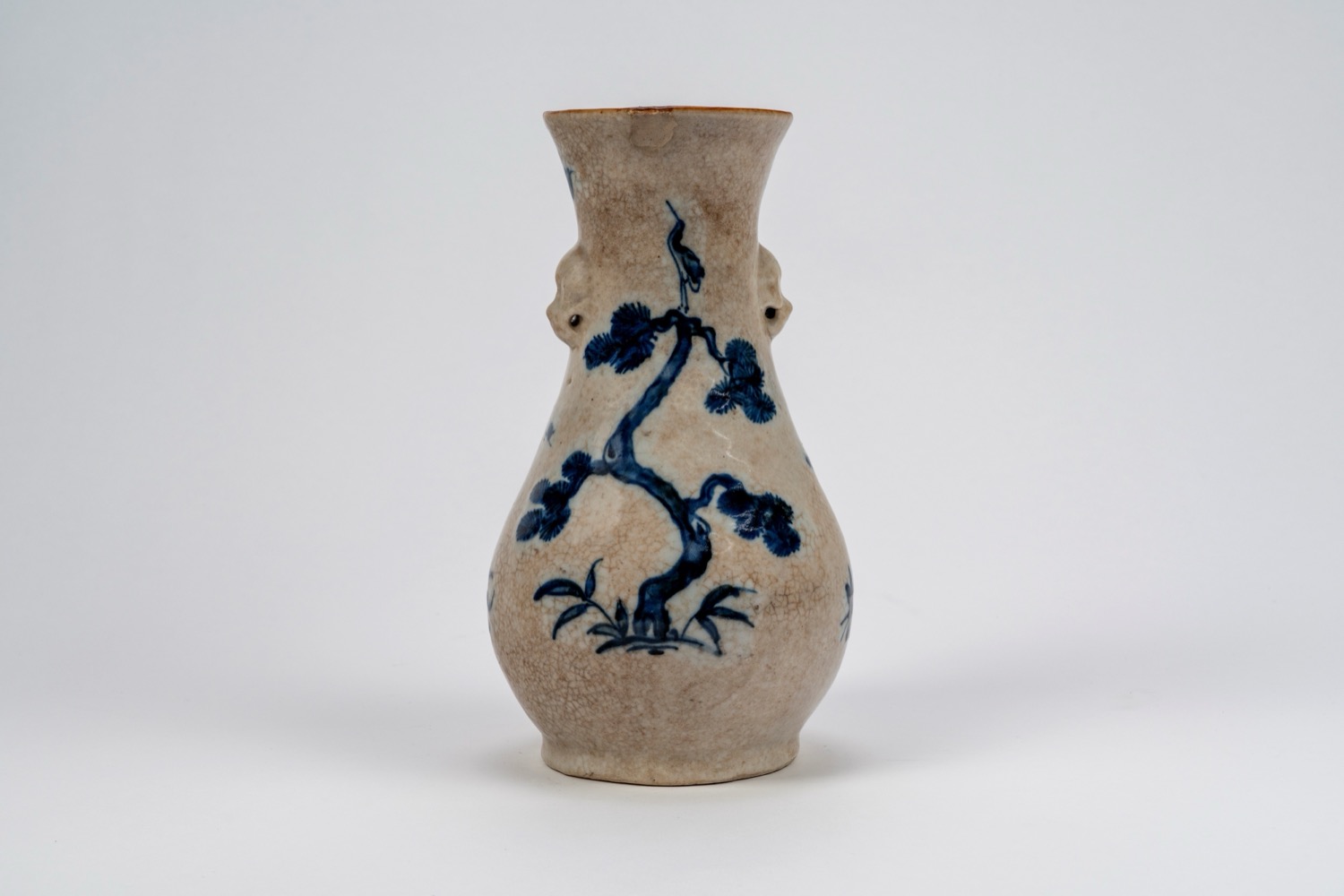 瓷瓶,通体开片纹,饰青花釉,中国制di corpo piriforme con collo cilindrico svasato, decorato con pino con gru posata su un ramo, bambù con voluta serpentina, rami fioriti e motivi floreali sparsi. Al collo, due prese a mascherone.