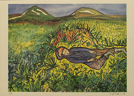 CORONA, anni 90' circa, litografia su cartoncino, cm 49x69, esemplare P.A. Al fronte: in basso a sinistra tiratura e in basso a destra firma. Opera con certificato di provenienza della galleria Daliano Ribani Arte. Opera senza cornice.