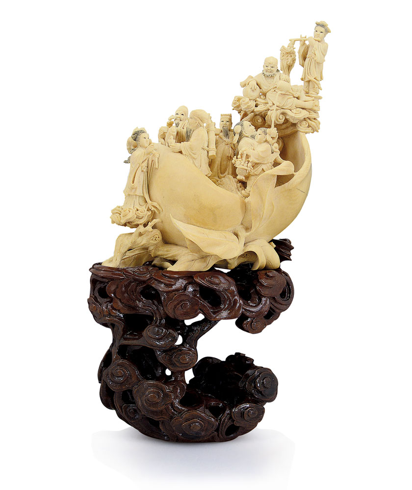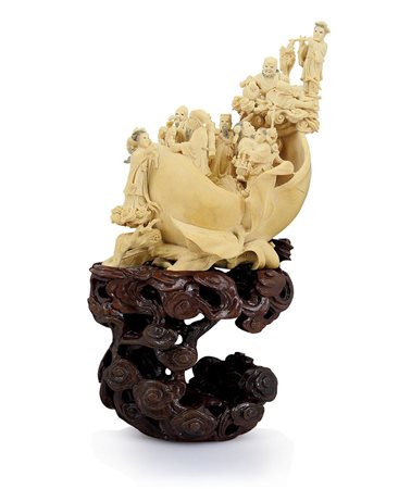 GRUPPO IN AVORIO, CINA, XIX SECOLO, raffigurante gli otto immortali Taoisti nel frutto dell'abbondanza; base in legno scolpito.