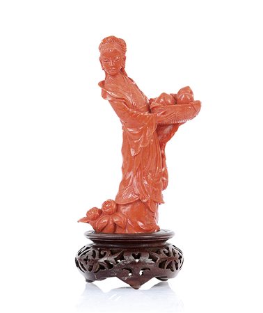 FIGURA IN CORALLO, CINA, XX SECOLO, raffigurante ragazza con cesto di frutti, base in legno.