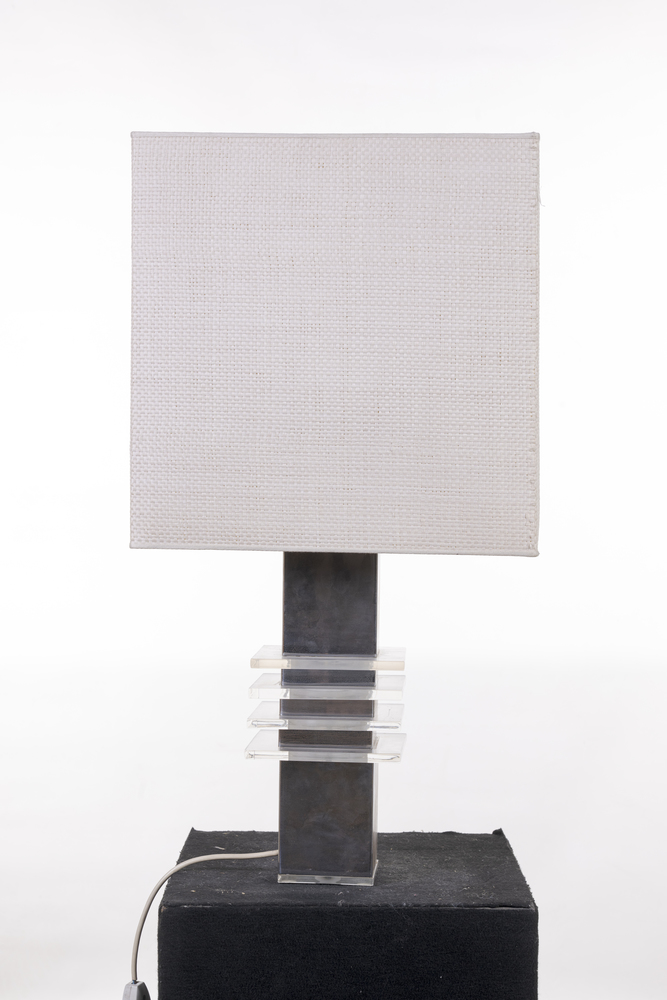 Brushed steel and plexiglass structure, fabric shade