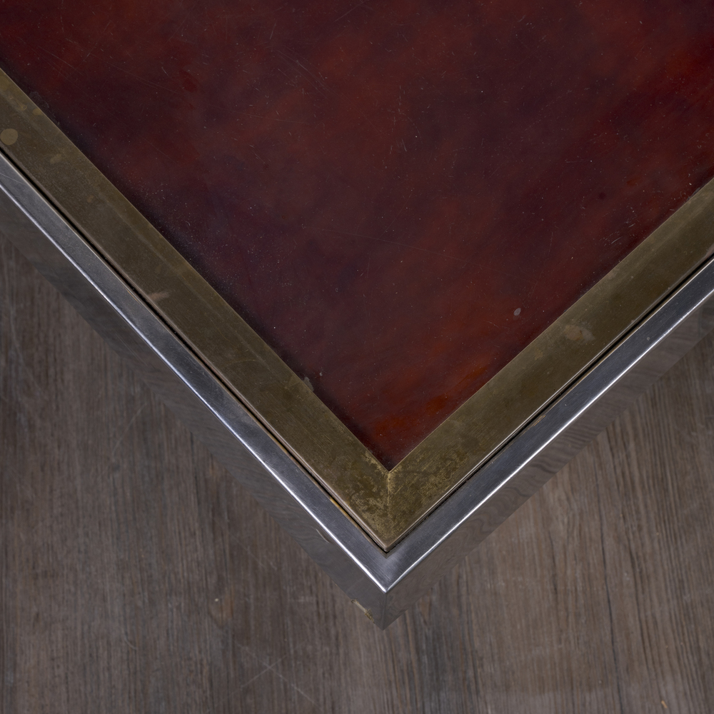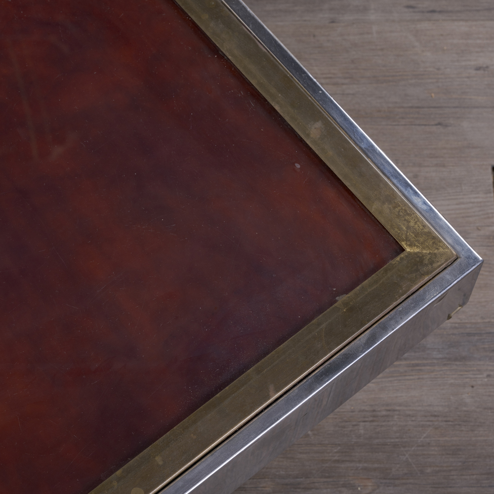 Structure in wood and lacquered wood, with brushed metal and brass trim, top in clear bevelled glass