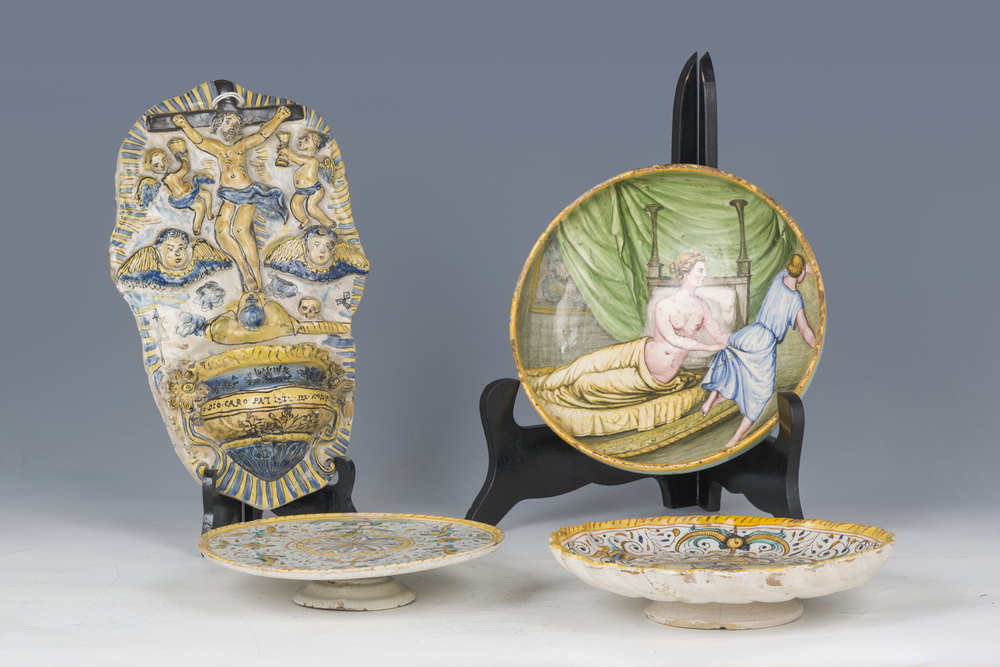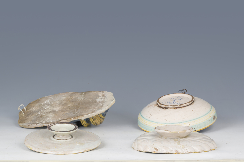 Due alzate, un piatto e un'acquasantiera, manifatture varie, XVII e XVIII secolo