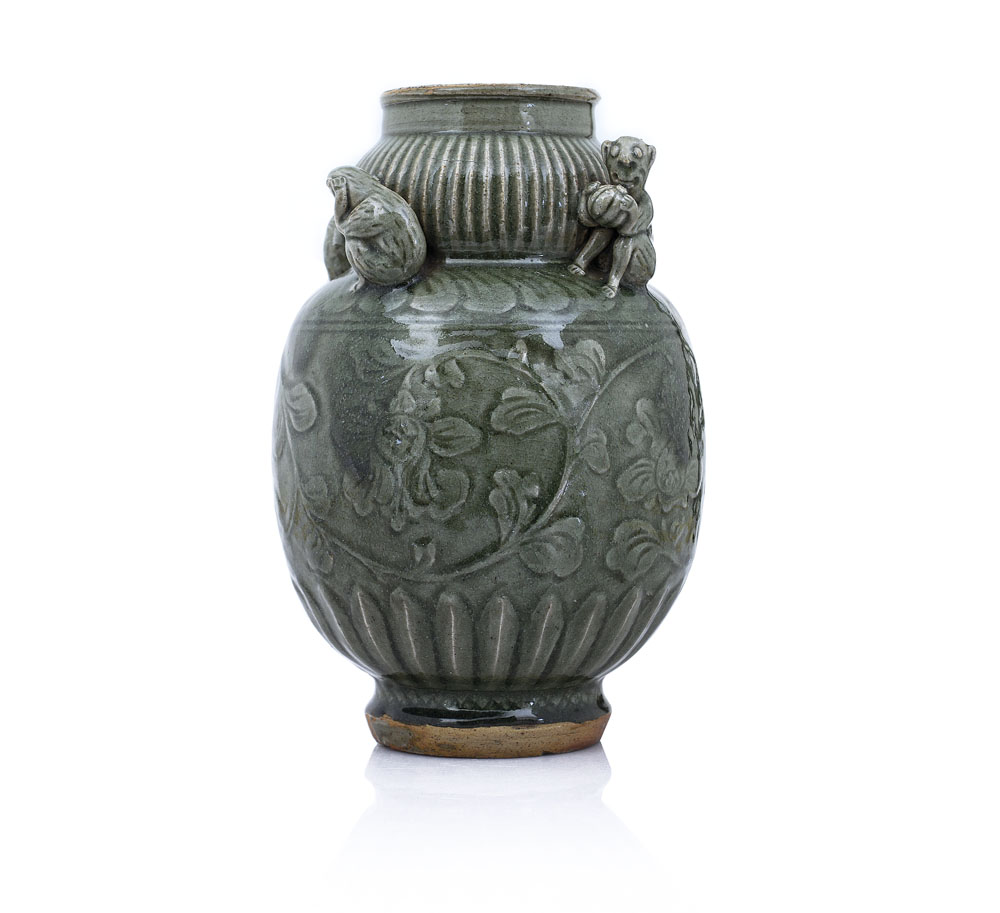 VASO IN CERAMICA CELADON INVETRIATA, CINA, XVIII SECOLO, ovoidale con orlo scanalato e scimmie applicate, decori arcaici incisi e a rilievo a motivi fitomorfi e baccellature.