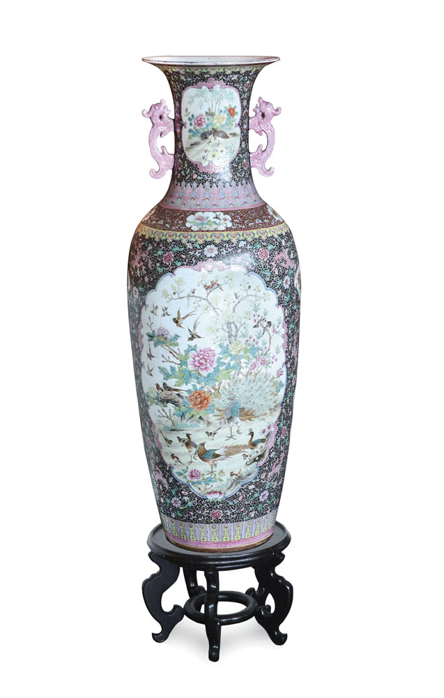 GRANDE VASO IN PORCELLANA, CINA, XX SECOLO, decoro a smalti policromi con figure e motivi floreali; base in legno.