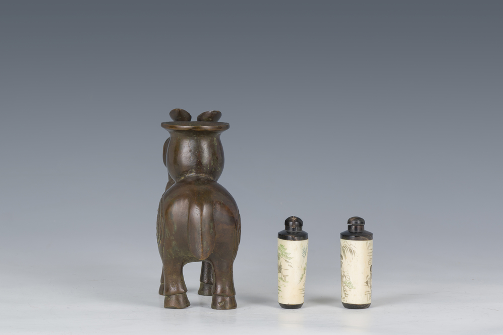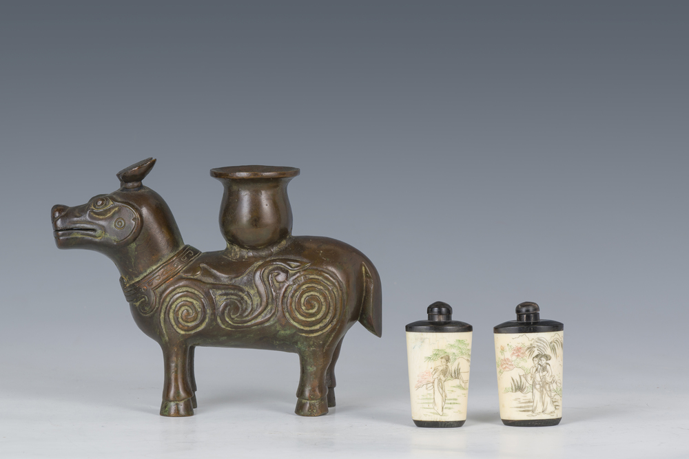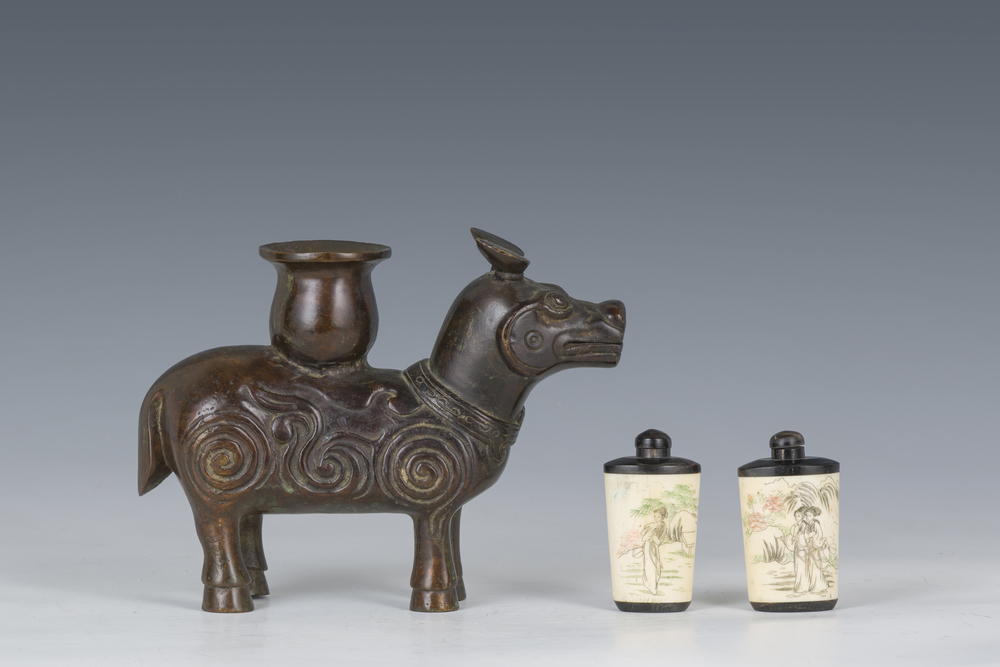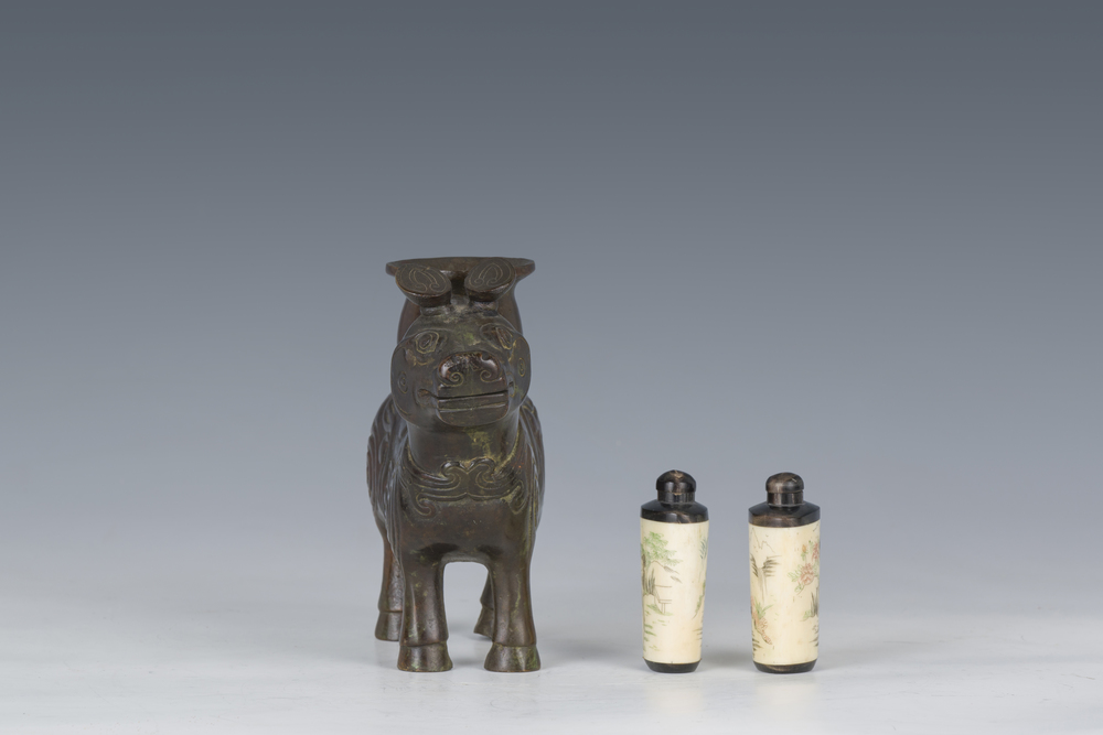 Lot consisting of a bronze tapir figure and two snuff bottles in carved bone depicting maidens within a landscape, China, 19th/20th century
