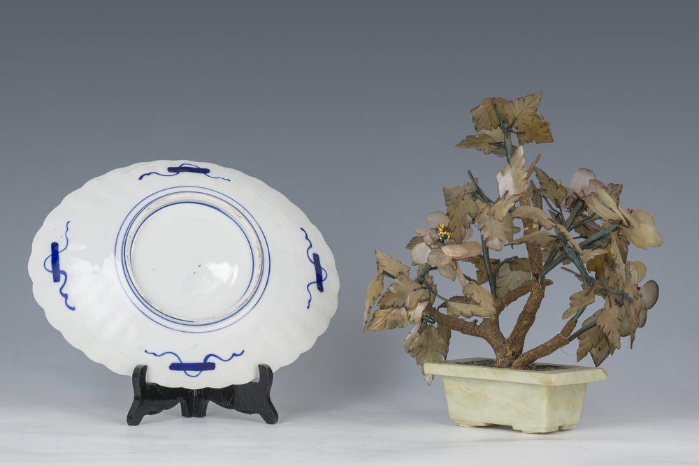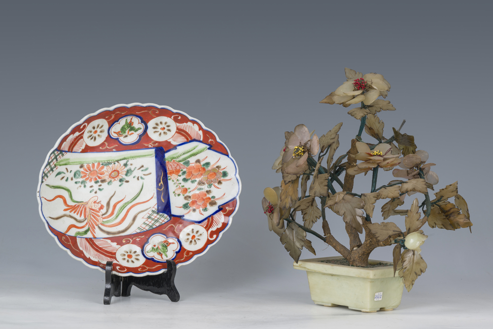 Lotto composto da un piatto in porcellana Imari e una figura di Bonsai decorato con giadeite e pietre dure, Giappone, periodo Meiji, XIX/XX secolo