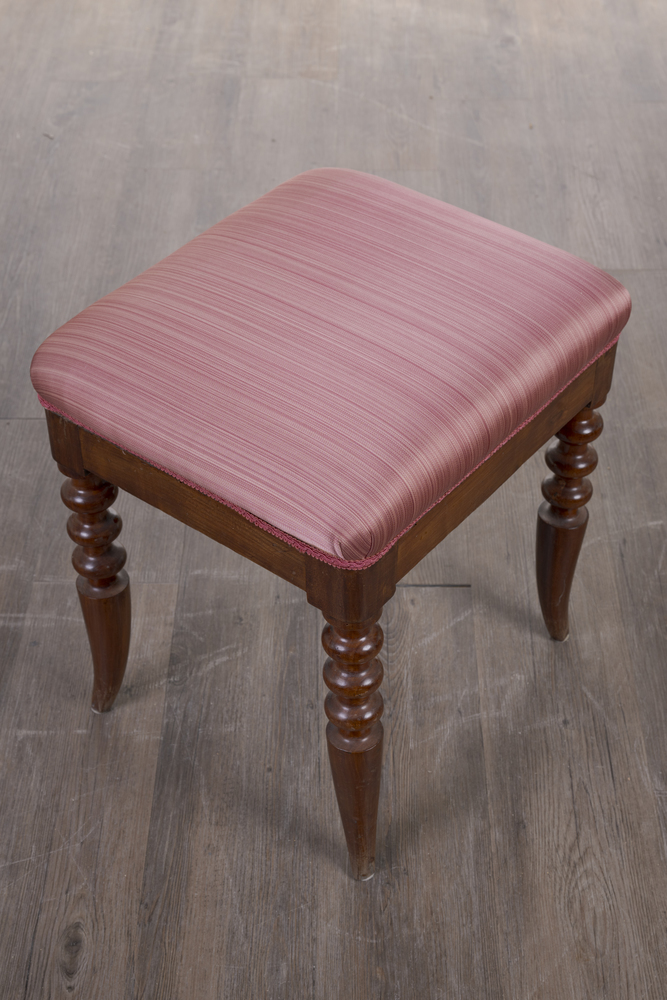 Struttura in legno, sostegni in legno tornito e lavorato, sedute in tessuto imbottito