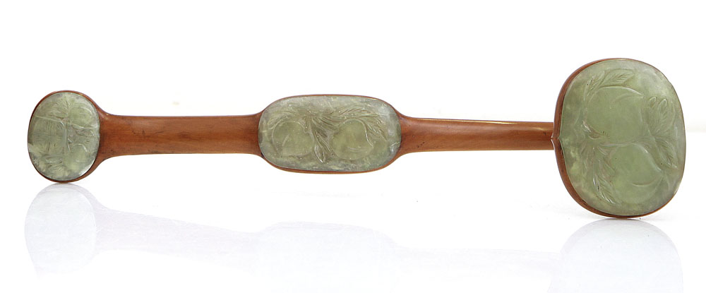 SCETTRO "GUY" IN LEGNO E GIADA, CINA, FINE XIX SECOLO, sagomato con tre elementi in giada scolpita a frutti; un elemento fessurato.
