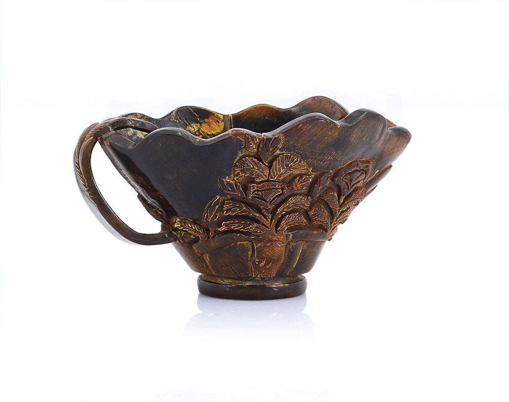 TAZZA IN CORNO DI RINOCERONTE, CINA, XIX SECOLO, a coppa svasata con manico e orlo ondulato, intagliata con decoro raffigurante fiori di loto.