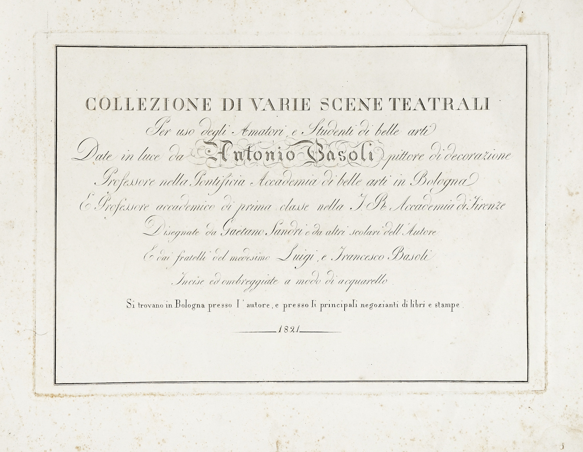 Antonio Basoli, Collezione di varie scene teatrali per uso degli amatori e Studenti di Belle Arti date in luce da Antonio Basoli pittore di decorazione Professore nella Pontificia Accademia di Belle Arti in Bologna e Professore accademico di prima classe... 1821.