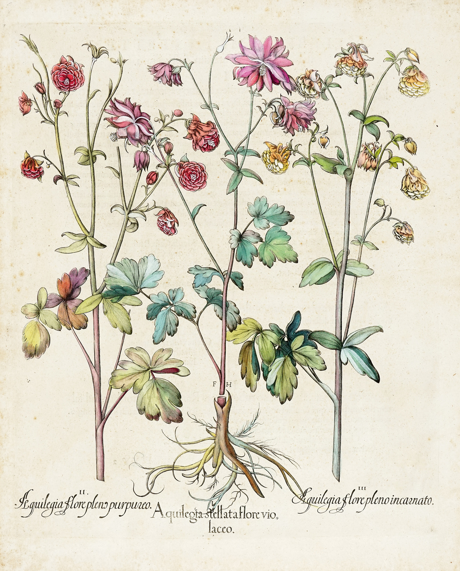 Basilius Besler, Helianthemum flore luteo, Eringium marinum, Helianthemum flore albo / Aquilegia flore pleno purpureo, Aquilegia stellata flore violaceo, Aquilegia flore pleno incarnato. 1613.