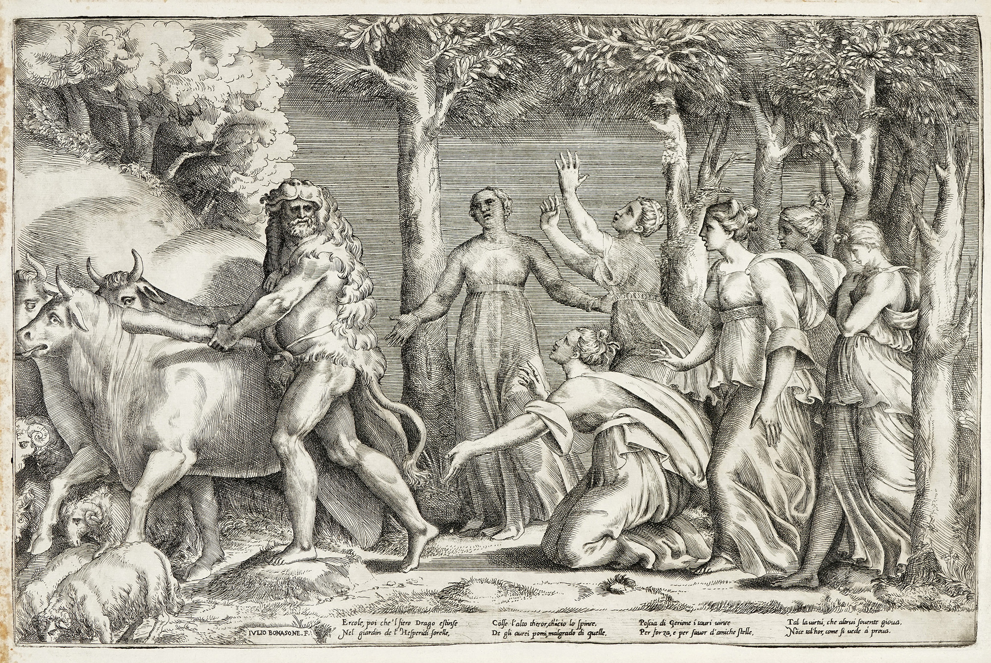 Giulio Bonasone, Ercole fugge con i buoi di Gerione, sulla destra le ninfe Esperidi. 1570.