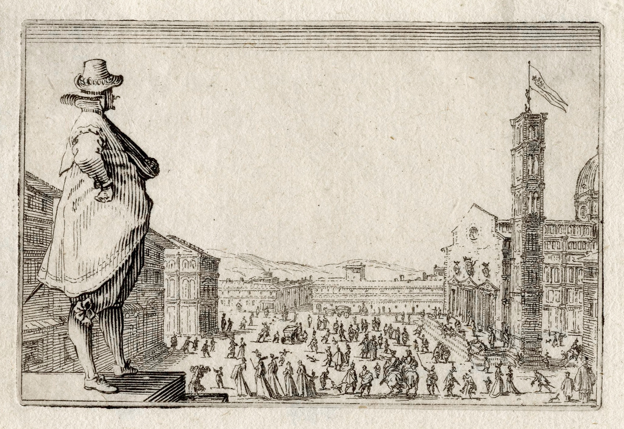 Jacques Callot, Cinque incisioni da Capricci di varie figure di Iacopo Callot: La place du Dôme, à Florence e quattro tavole impresse sul medesimo foglio. 1617.
