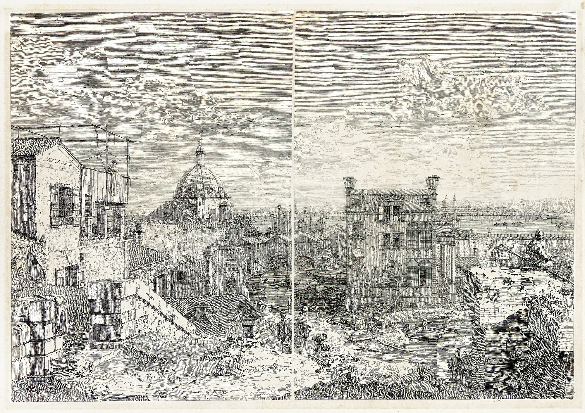 Acquaforte. mm 298x215 e mm 297x215. Foglio: mm 320x450. Bromberg, 13 e 14. Montecuccoli degli Erri, 12 e 13. Per la lastra indivisa si veda Bromberg, 12. Montecuccoli degli Erri, 32. Con il monogramma "A.C" di seguito alla data sulla facciata della casa a sinistra, e di nuovo al margine inferiore a destra. Bellissima e rara prova, dopo il taglio della lastra, stampata con segno brillante e uniforme su carta vergellata veneta con filigrana "giglio stilizzato" segnalata da Montecuccoli degli Erri per la seconda edizione coeva (Montecuccoli degli Erri, 10b, non compare la lettera A). Nell'esemplare presente le due lastre, rispettivamente stato unico e II stato di 2, sono impresse molto ravvicinate tra loro. (1) Margini di 10 mm ai lati, di mm 15 in basso, reintegro di carta per tutta la lunghezza del margine superiore oltre la battuta del rame. Due lievi spellature restaurate al margine superiore a destra e in alto al centro. Debole ingiallimento da esposizione. Due minimi residui cartacei in alto al verso.