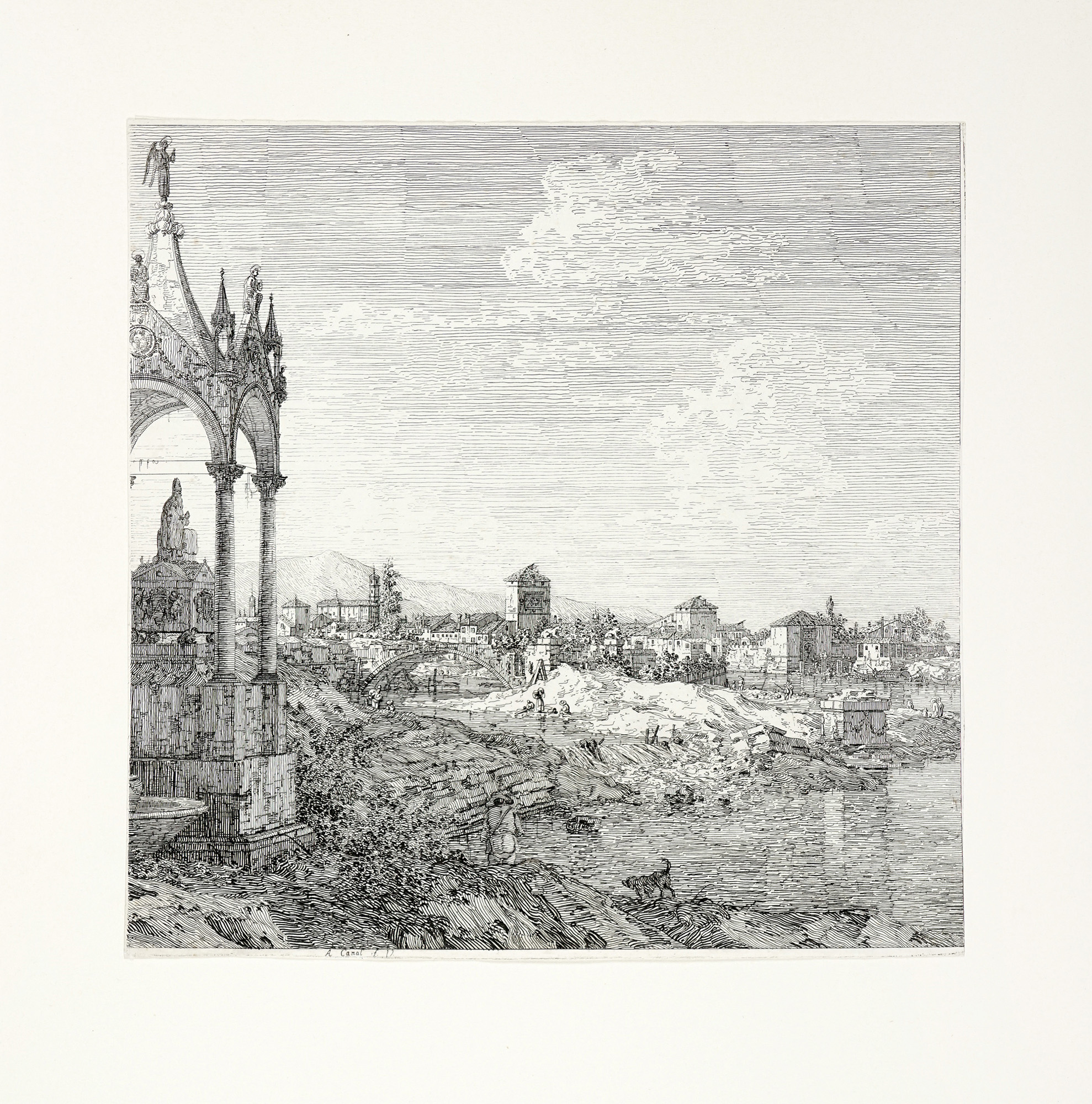Acquaforte. mm 300x301. Bromberg, 16. Montecuccoli degli Erri, 14. Al di sotto dell'immagine verso sinistra "A Canal f. V." . Ottima impressione nel II stato di 2 per Bromberg e nello stato unico per Montecuccoli. Si tratta della parte di destra di una lastra originariamente comprensiva anche de La tomba del vescovo (Bromberg, 15. Montecuccoli, 30) e del Frammento della tomba del vescovo (Bromberg, 17. Montecuccoli, 35). Montecuccoli riferisce che non esiste alcun esemplare impresso dalla lastra intera. Bella carta vergellata veneta lievemente spessa priva di filigrana. (1) Esemplare rifilato all'impronta del rame, visibile a tratti segnatamente in basso, e con sottile margine oltre la linea d'inquadramento. Foglio applicato per due punti in alto a cartoncino moderno.