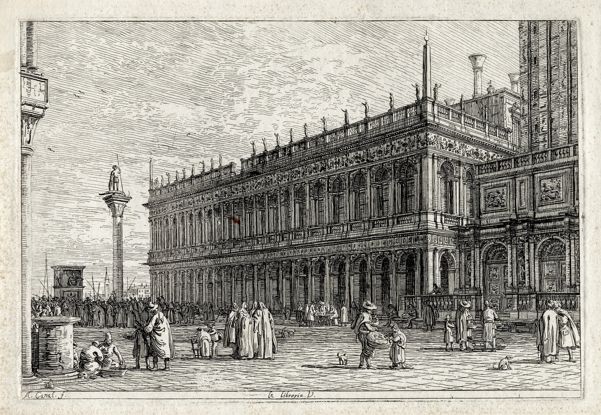 Acquaforte. mm 145x209. Foglio: mm 165x231. Bromberg, 18. Montecuccoli degli Erri, 15. Al di sotto dell'immagine le scritte "A. Canal f." a sinistra e al centro "La Libreria V.". Ottima impressione nella tiratura postuma della calcografia bassanese Remondini, nel II stato di 3 per Bromberg, e nel I stato di 2 per Montecuccoli dopo la comparsa del titolo definitivo e l'aggiunta di una linea verticale a destra sul capitello della colonna di San Teodoro; prima della cancellazione del titolo e della comparsa del graffio obliquo dall'apertura nella balaustra verso il basso. Carta vergellata con filigrana lettera "R". (1) Esemplare con margini di 7/14 mm oltre la battuta del rame applicato per due punti in alto entro passepartout moderno. Minima macchia di ruggine sulla facciata della libreria verso sinistra.