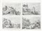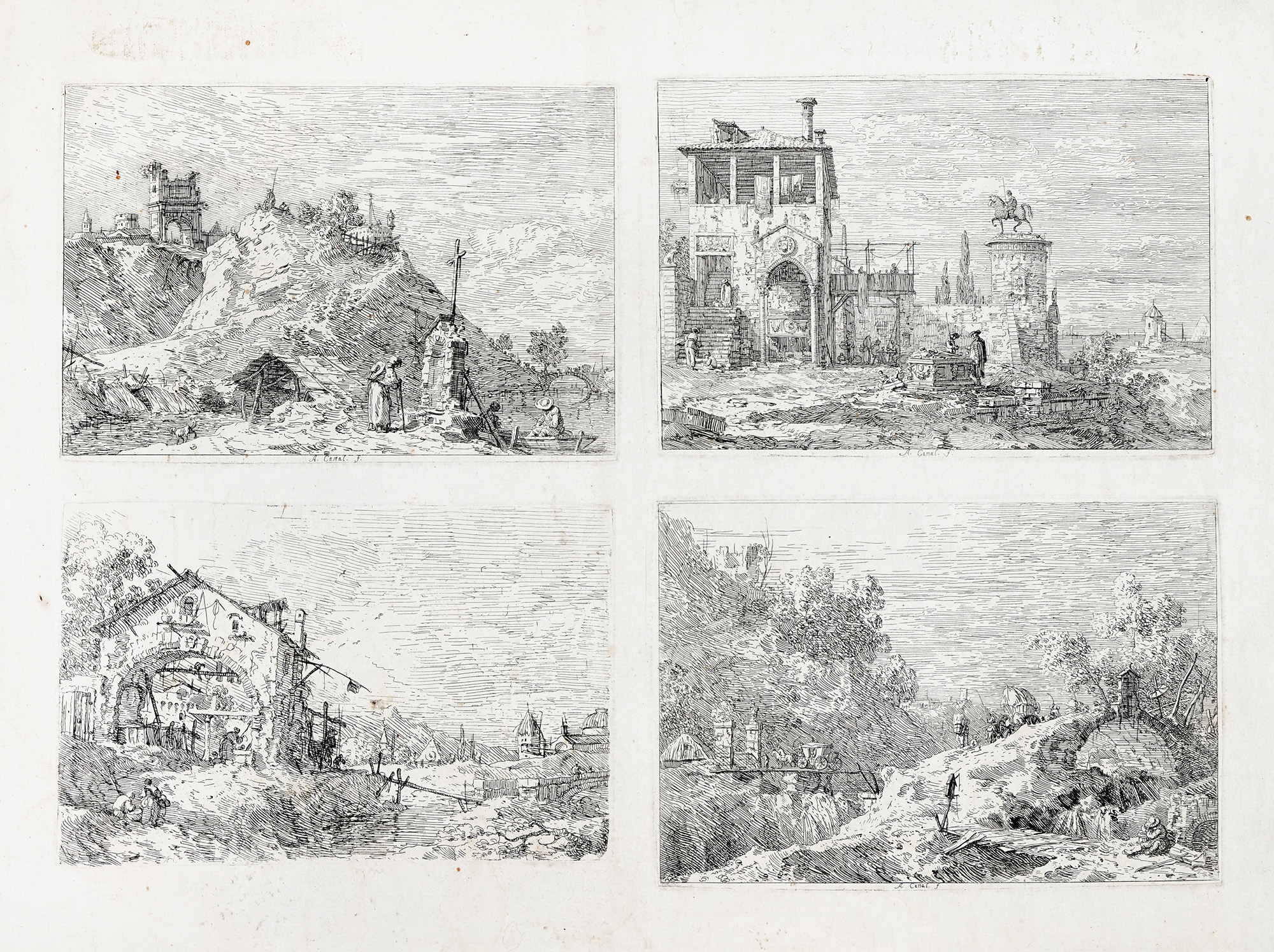 Quattro lastre impresse su unico foglio di mm 375x505 in carta vergellata con filigrana lettera "R" (cfr. Montecuccoli degli Erri, p. 193, e nn.15a e 15b). 1) Paesaggio con pellegrino in preghiera. Acquaforte. mm 142x210. Bromberg, 27. Montecuccoli degli Erri, 23. Al di sotto dell'immagine al centro "A. Canal f.". Stato unico per Montecuccoli e III su 3 per Bromberg. 2) Paesaggio con cinque ponti. Acquaforte. mm 143x210. Bromberg, 22. Montecuccoli degli Erri, 24. Al di sotto dell'immagine al centro "A. Canal f.". II stato su 3 per Montecuccoli dopo la comparsa del graffio orizzontale alla sommità della montagna a sinistra, non censito da Bromberg. 3) Paesaggio con donna al pozzo. Acquaforte. mm 138x206. Bromberg, 29. Montecuccoli degli Erri, 25. In basso verso sinistra nell'inciso la sigla "A.C.". II stato di 4, con la crepa alla base del muro destro della casa di 4-5 mm, e II stato variante b di 3 per Bromberg. 4) Paesaggio con monumento equestre. Acquaforte. mm 142x207. Bromberg, 23. Montecuccoli degli Erri, 26. Al di sotto dell'immagine al centro "A. Canal f.". Nell'unico stato sia per Bromberg che per Montecuccoli. (1) Foglio con ampi margini applicato in alto su supporto telato. Traccia di piega verticale al centro. Minime sporadiche macchie.