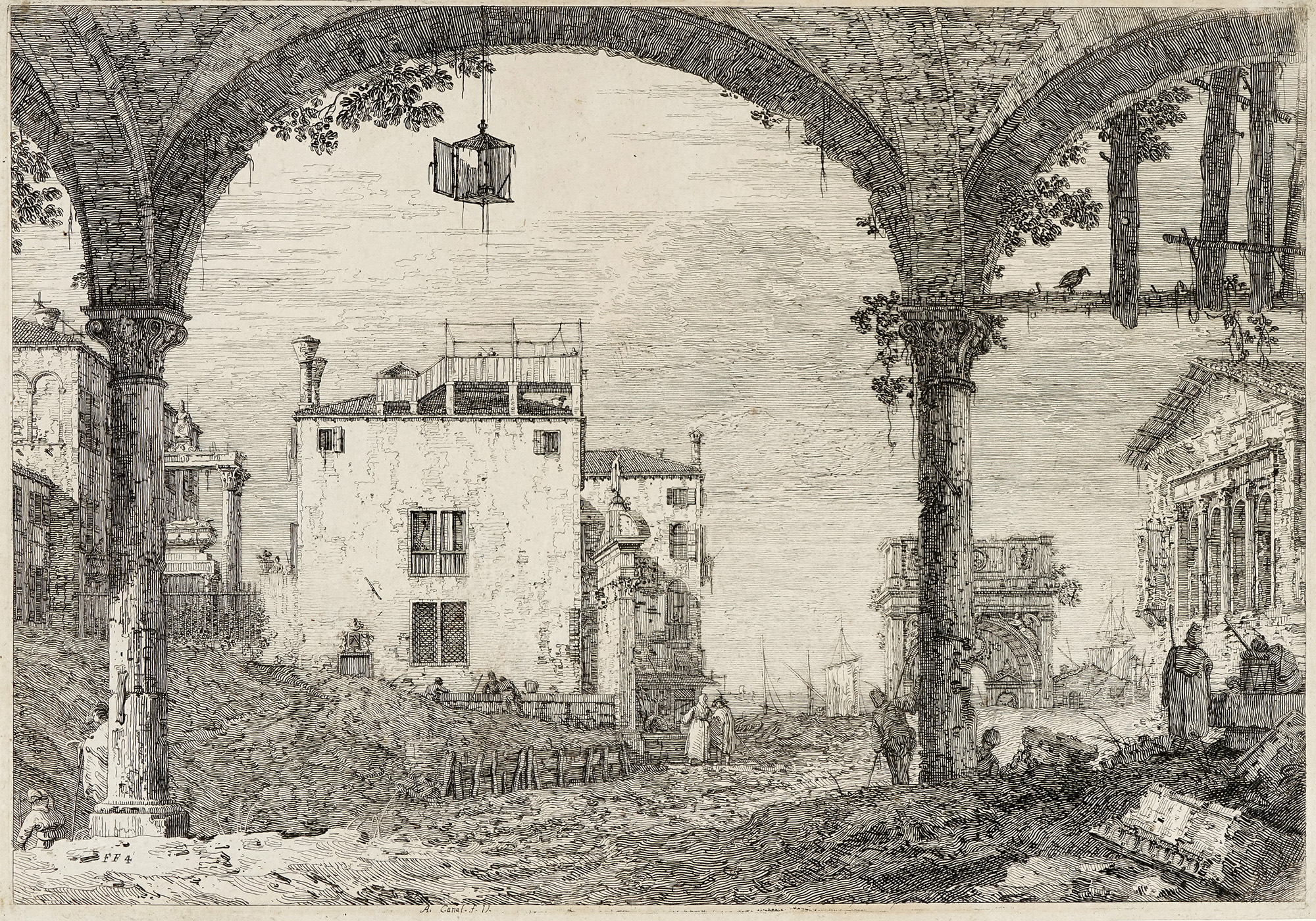 Acquaforte. mm 300x430. Foglio: mm 310x443. Bromberg, 10. Montecuccoli degli Erri, 10. Al di sotto dell'immagine al centro "A. Canal f. V.". Ottima prova, ben inchiostrata e nitida, nel III stato su 3 per Bromberg e per Montecuccoli, dopo la comparsa della sigla "FF4" alla base della colonna di sinistra. Carta vergellata sottile apparentemente priva di filigrana. In basso al verso marchio di collezione non identificato a inchiostro blu/violetto con lettere entro triangolo. (1) Esemplare applicato per due punti in alto a cartoncino moderno. Margini di 4/5mm oltre la battuta del rame. Minime spellature ai quattro angoli al verso.
