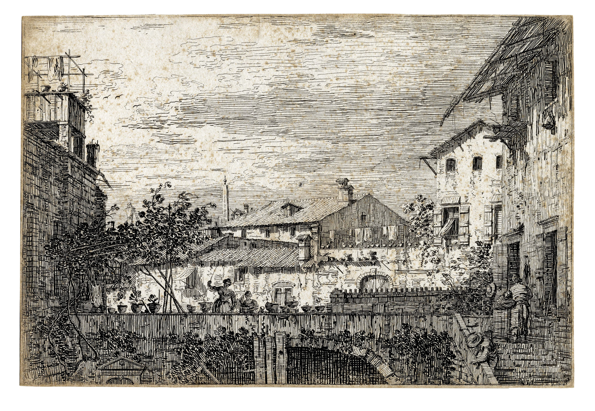 Acquaforte. mm 144x213. Bromberg, 24. Montecuccoli degli Erri, 19. Al di sotto dell'immagine al centro "A Canal f.". Ottima impressione nella tiratura postuma della calcografia bassanese Remondini, nel III stato di 3 per Bromberg, e nel II stato di 2 per Montecuccoli dopo la cancellazione della firma. Carta vergellata spessa priva di filigrana. (1) Esemplare con sottili margini oltre la linea d'inquadramento applicato per due punti in alto entro passepartout moderno. Sporadici punti di fioritura e lieve ingiallimento alle estremità del foglio. Piccola spellatura a uno degli angoli in basso al verso.