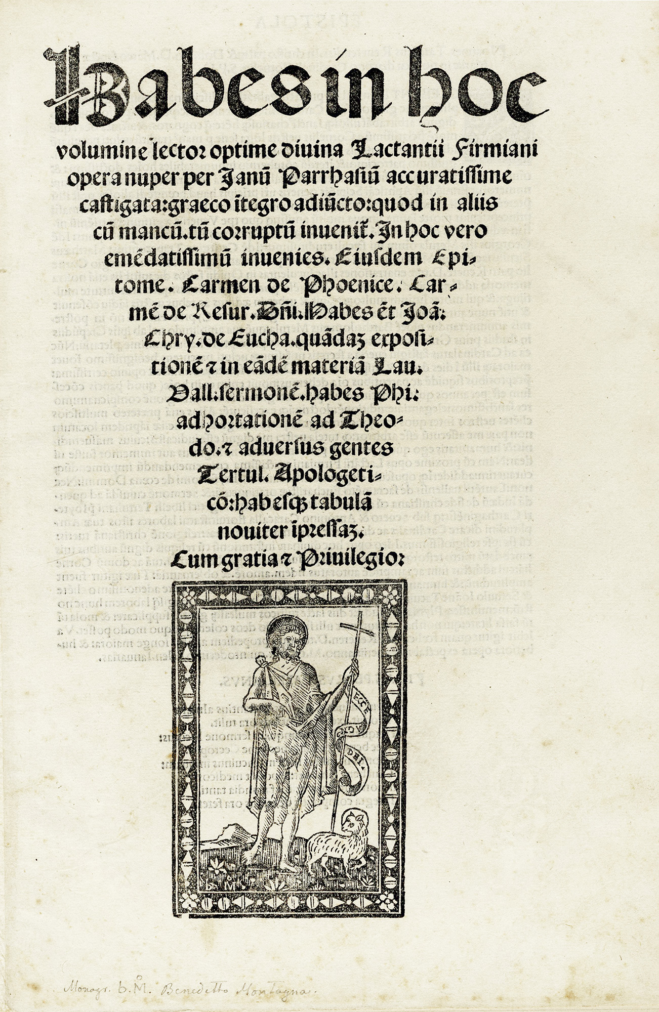 Xilografia. mm 102x70. Foglio: mm 305x204. Con il monogramma "b M°" sulla matrice in basso a sinistra. Marca tipografica al frontespizio del volume Lucius Caecilius Firmianus Lactantius, Habes in hoc volumine lector optime Diuina Lactantii Firmiani opera nuper per Ianum Parrhasium accuratissime castigata:...,Venezia, Giovanni Tacuino, 1509. Carta vergellata sottile apparentemente priva di filigrana. SI AGGIUNGONO: Antoine Vincent (1500-1568). I Santi Pietro e Paolo con il velo della Veronica. Xilografia. mm 146x147. Con il monogramma nella tavoletta appesa alla vite. Da Barthélémy de Chasseneux (1480-1541?),Catalogus gloriae mundi, laudes, honores, excellentias ac preeminentias omnium fere statuum...Lugduni: impressum per G. Regnault, 1546. (1) OPERA 1: foglio integro applicato lungo il margine sinistro a cartoncino moderno. Traccia di lievi fioriture. OPERA 2: esemplare rifilato all'immagine applicato in alto a supporto moderno.