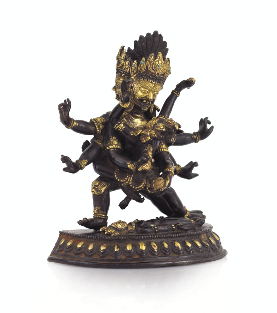 GRUPPO IN BRONZO PATINATO E DORATO CON APPLICAZIONI, CINA, DINASTIA QING, XVIII SECOLO, raffigurante Yamantaka distruttore della morte, applicazioni in corallo e turchese.