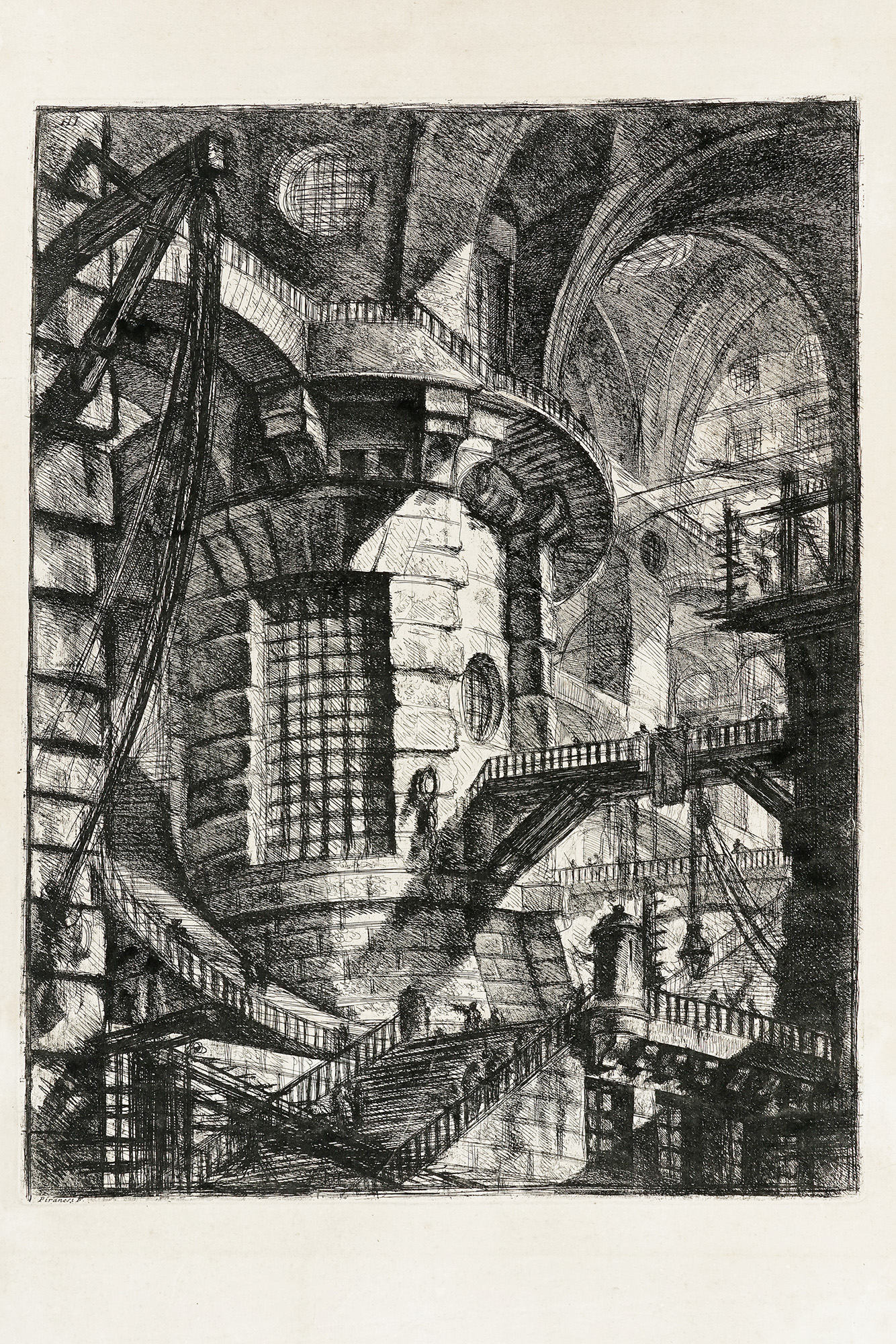 Acquaforte, bulino, tintura di zolfo o morsura aperta, brunitoio. mm 544x413. Foglio: mm 700x455. Focillon, 26. Hind, 3. Robison, 30. Terza tavola da Carceri d'invenzione. Ottima prova nel V stato di 6 dalla II edizione, IV uscita (metà anni Settanta - 1835 ca., fino alle prime impressioni della V edizione). Carta vergellata apparentemente priva di filigrana. (1) Foglio lievemente ingiallito con margini come in origine, mm 20/24 i laterali e mm 65/90 il superiore e l'inferiore, minima brunitura alle estremità. Traccia di alone nella parte bassa del foglio, rilevante solo al verso.