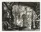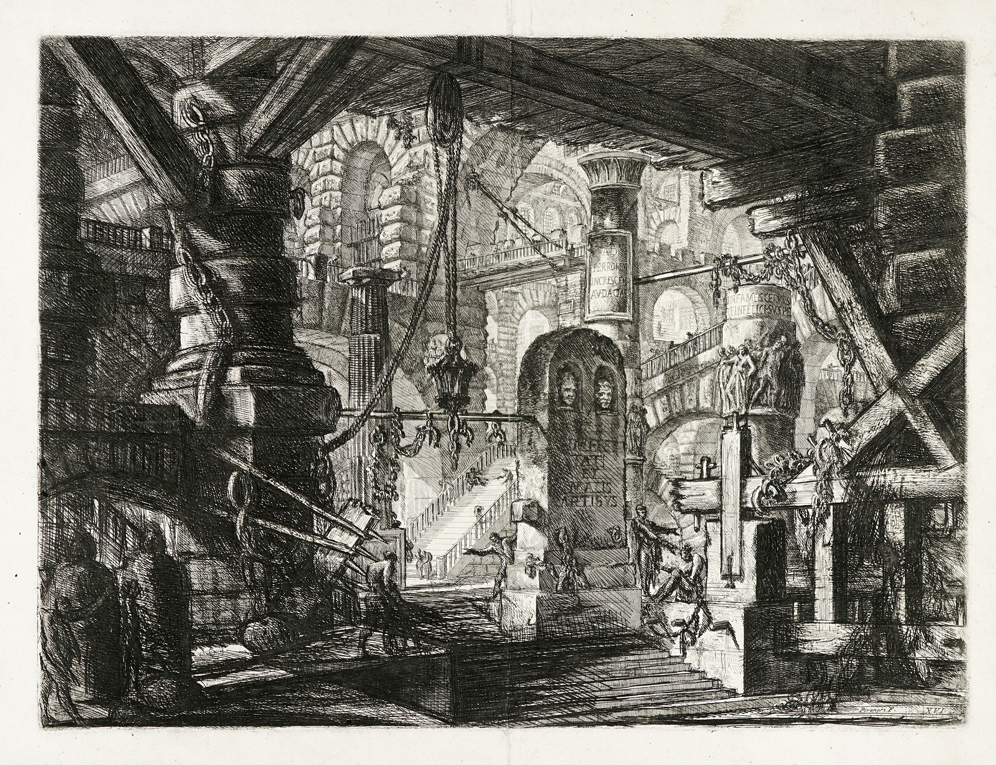 Acquaforte, bulino, tintura di zolfo o morsura aperta, brunitoio. mm 407x550. Foglio: mm 458x693. Focillon, 39. Hind, 16. Robison, 42. Sedicesima tavola da Carceri d'invenzione, con la firma e il numero "XVI" sulla lastra in basso a destra. Bellissima impressione nel V stato di 6 dalla II edizione, IV uscita (metà anni Settanta - 1835 ca., fino alle prime impressioni della V edizione). Carta vergellata pesante con filigrana "fiore di giglio in doppio cerchio sormontato da lettera B" (Robison, 39/39 bis. 1790 ca.). (1) Foglio integro, margini di mm 20/27 in alto e in basso, di mm 70 ai lati. Piega verticale al centro rinforzata al verso, e altre due pieghe parallele ai margini laterali per adattare il foglio alla cornice. Lieve traccia di brunitura lungo la linea di piegatura delle due pieghe laterali e all'estremità del margine superiore. Piccola macchia al margine destro in basso.