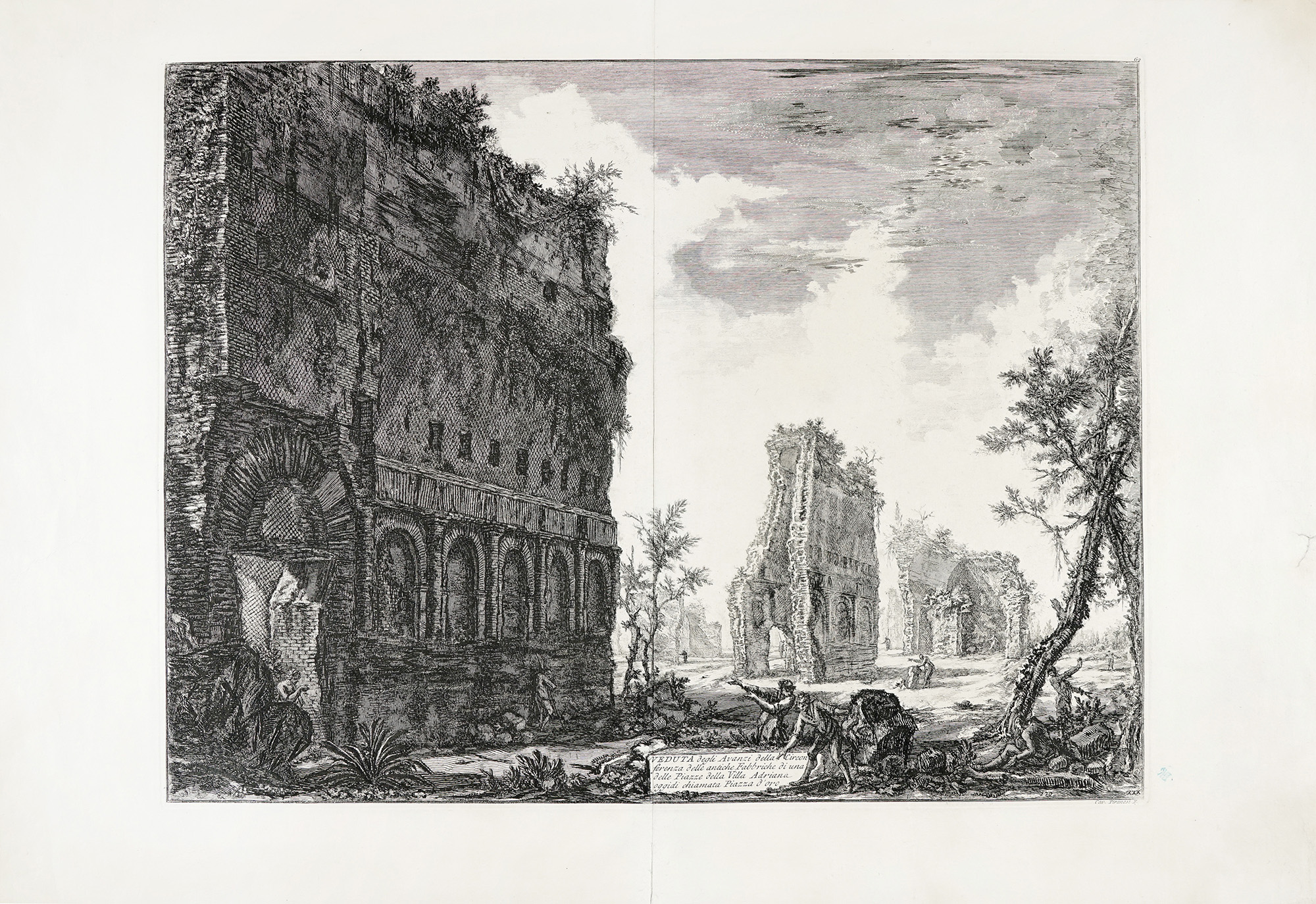 Acquaforte. mm 474x623. Foglio: mm 594x873. Focillon, 846. Hind, 132. Con la firma al margine inferiore a destra. Dalle Vedute di Roma, serie in 135 lastre alla quale Piranesi iniziò a lavorare dal 1748 e che continuò ad accrescere con nuove tavole per tutto l'arco della sua vita. Ottima prova nel III stato di 4 (I edizione di Parigi), con i numeri "129 XXX" sulla lastra in basso a destra, e il numero "62" all'angolo in alto dallo stesso lato. Carta vergellata con filigrana lettere "TF" (Robison, 93) segnalata per la I edizione parigina. Al margine inferiore a destra marchio a inchiostro blu della collezione del conte Nicolas Aleksandrovitch Kouchelev-Bezborodko (Saint-Pétersbourg, 1834-1862) (Lugt,1629). (1) Foglio integro con margini come in origine. Piega di legatura in verticale al centro aperta in basso per breve tratto e con brachetta al verso. Strappo a metà dell'estremità destra riparato al verso con nastro di carta.