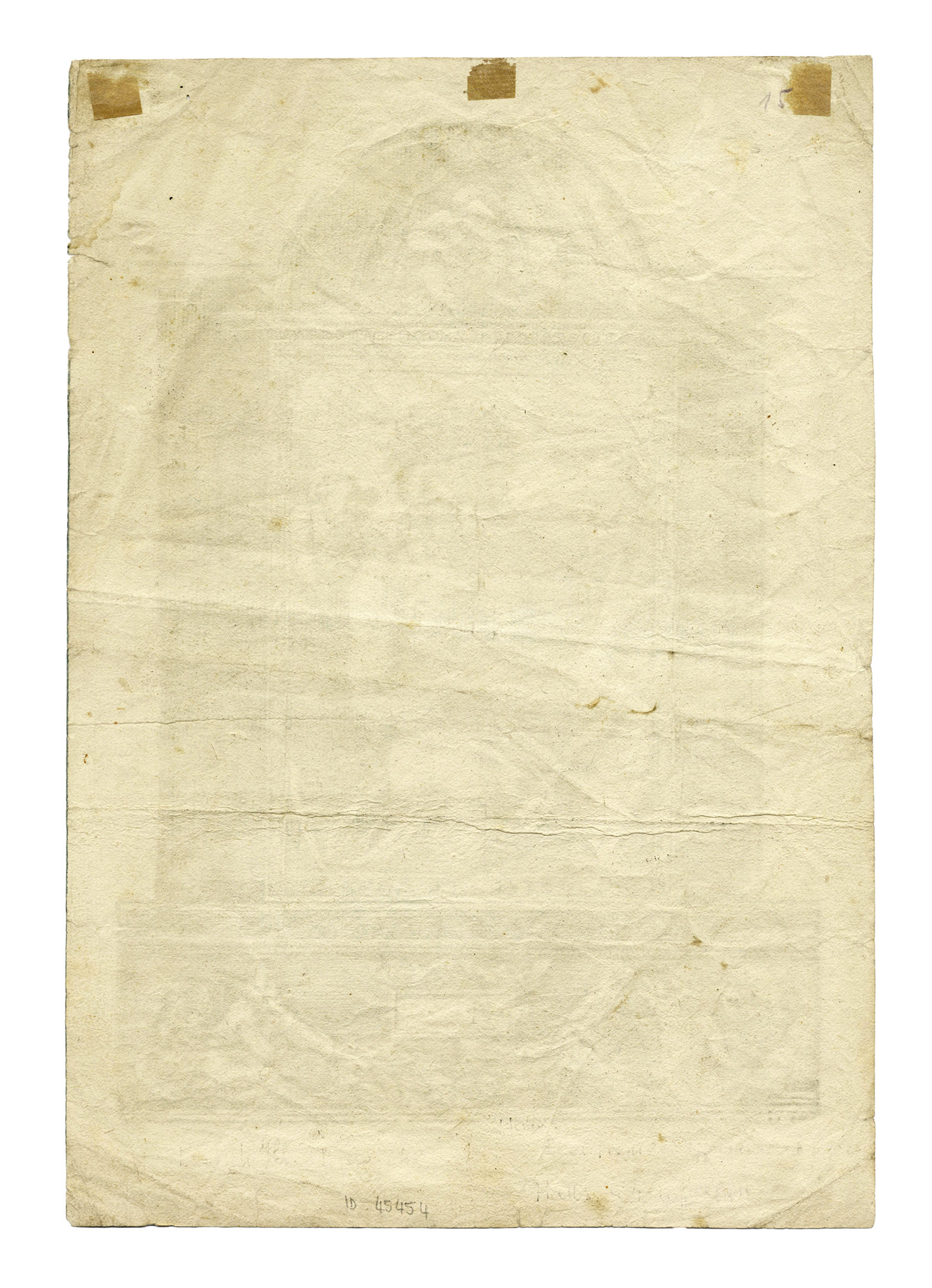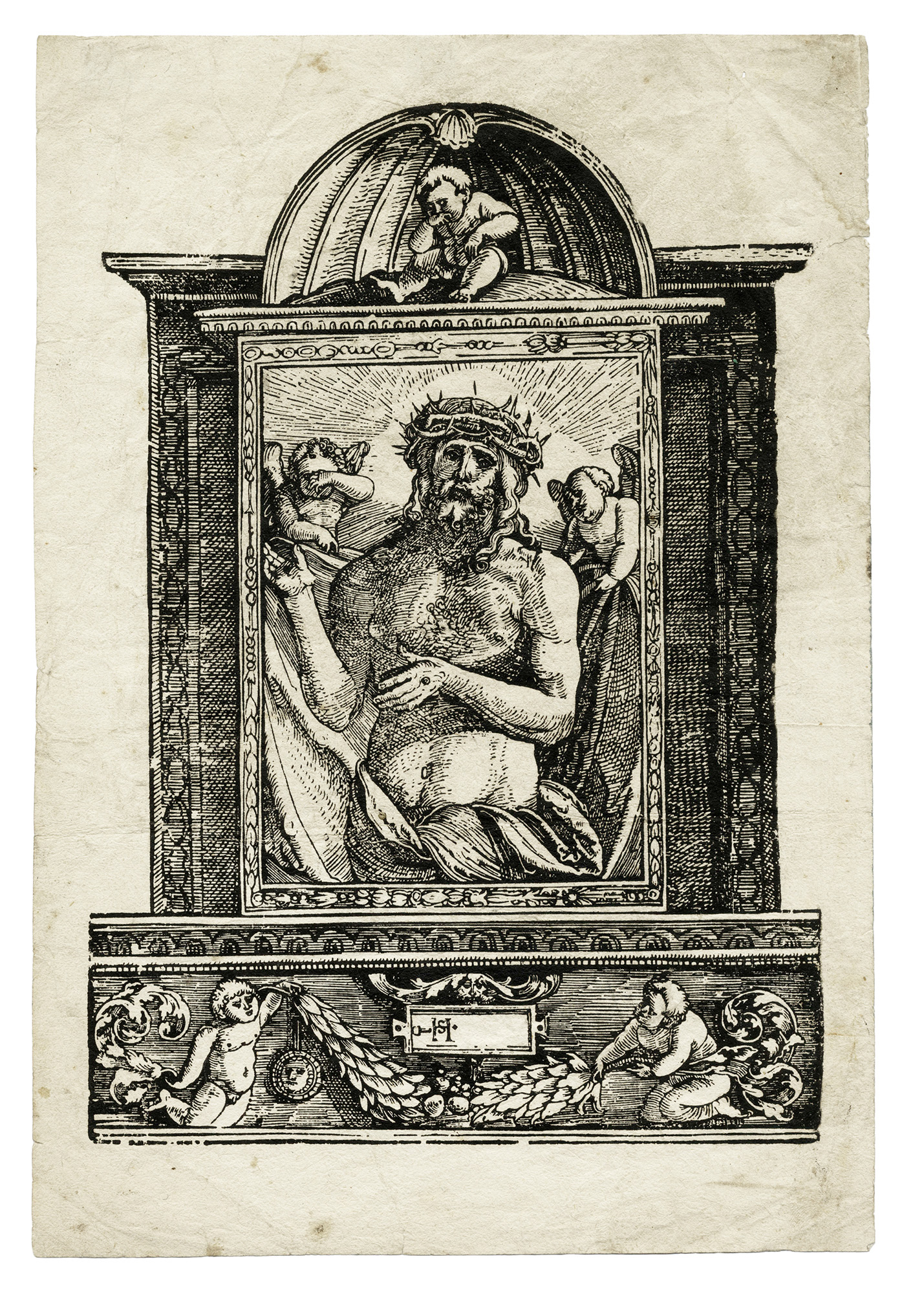 Xilografia. mm 243x170. Foglio: mm 283x195. Bartsch, VII, 41. Hollstein, 17. Con il monogramma affiancato da una pala sulla tavoletta al centro nel basamento dell'edicola. Cristo come uomo dei dolori è raffigurato a mezzo busto, frontale rispetto all'osservatore e affiancato da due angeli che reggono un drappo. Il gruppo è inserito in un'edicola architettonica con in alto un putto piangente seduto in un ornamento a conchiglia, in basso due putti che reggono un festone di foglie e frutta. Ottima prova stampata con segno nitido su carta vergellata sottile con parte di filigrana "stemma di Württemberger" (Briquet, 1178. Stuttgart, 1557). (1) Foglio con grandi margini, lieve traccia di pieghe, alcuni brevi strappi alle estremità. Segni d'uso.