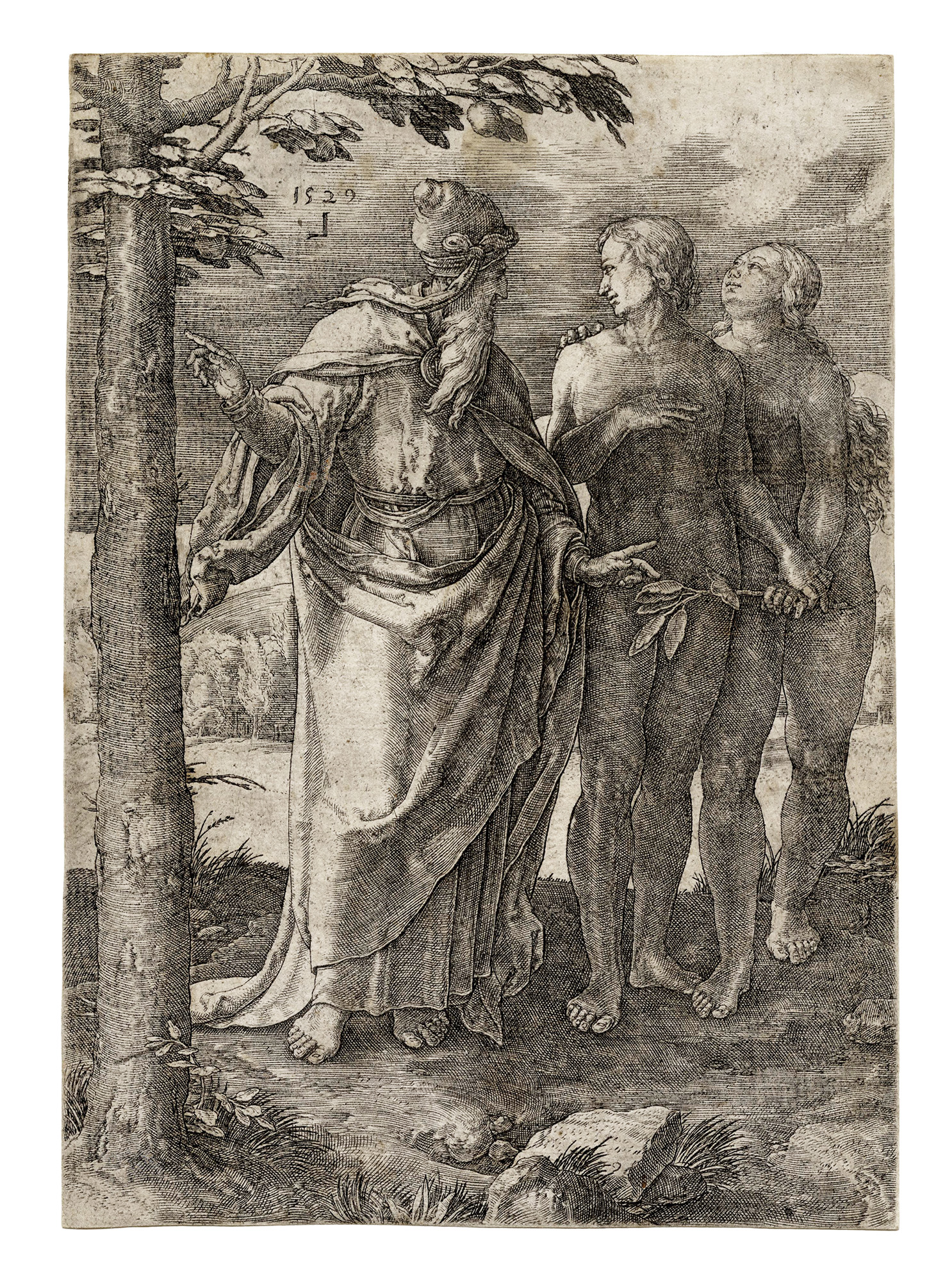 Bulino. mm 164x116. Bartsch, VII, 2. New Hollstein, 2. Con il monogramma in controparte e la data "1529" sulla lastra in alto verso sinistra. Seconda tavola da una serie di sei dedicata alla Storia di Adamo ed Eva. Ottima impressione di questa rara incisione nel III stato di 3 su carta vergellata priva di filigrana. (1) Esemplare applicato per due punti in alto entro passepartout moderno. Rifilato all'impronta del rame, quasi interamente visibile. Sporadiche e deboli macchioline brune rilevanti soprattutto al verso.