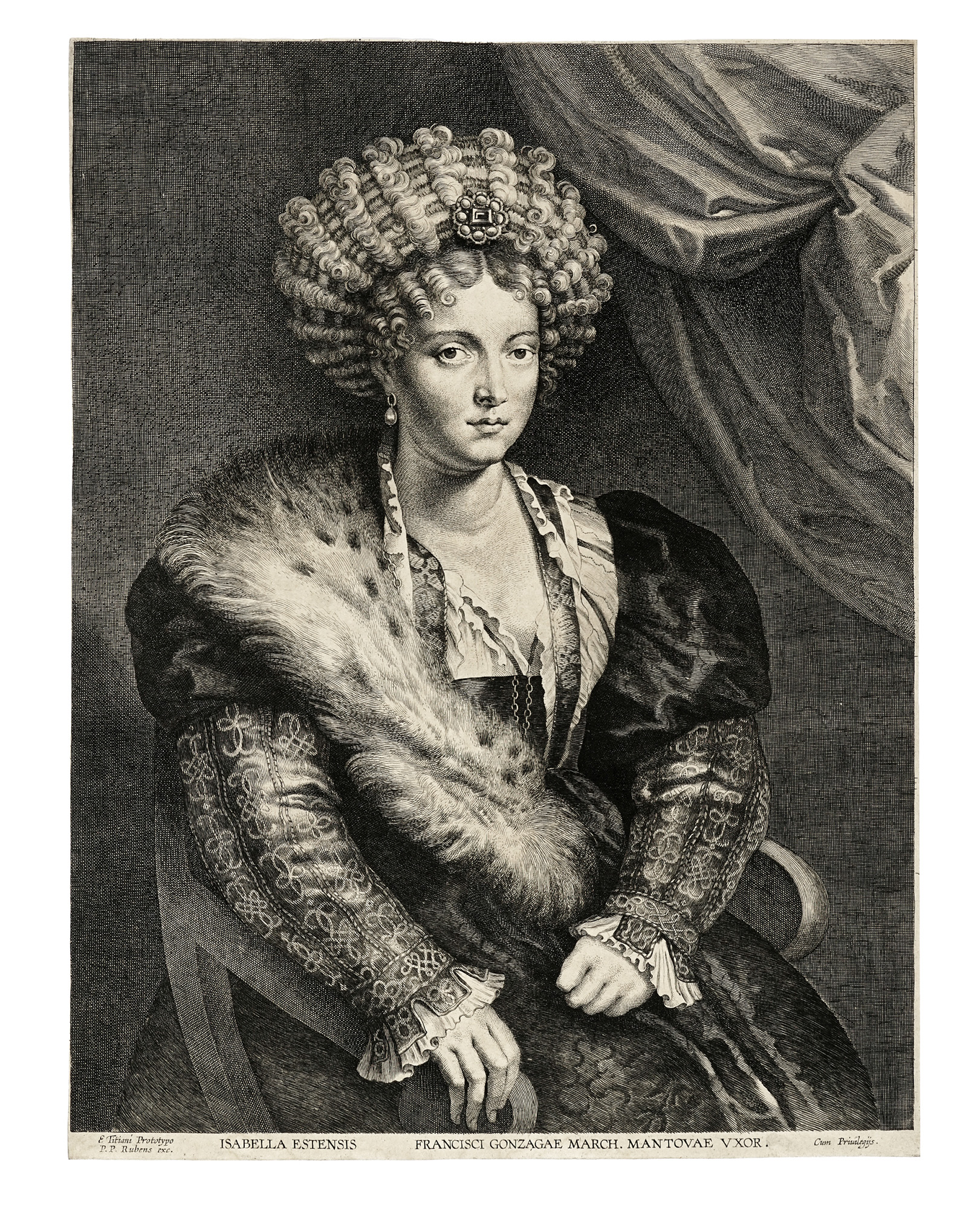 Bulino. mm 420x318. Hollstein,165. Ritratto di Isabella d'Este tratto in controparte da un dipinto di Rubens a sua volta tratto da originale di Tiziano (Vienna, Kunsthistorisches Museum, inv. no. 83). Bella impressione su carta vergellata spessa con filigrana "giglio di Strasburgo". (1) Esemplare rifilato all'impronta del rame visibile a tratti. Minimi residui di carta al verso.