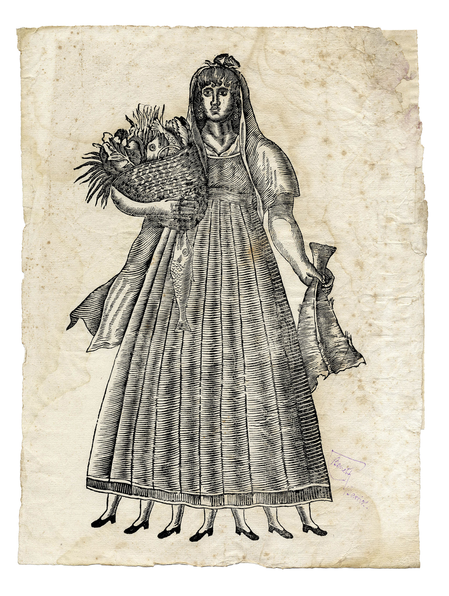 Xilografia. mm 380x290. La Vella Quaresma (Vecchia Quaresima) o Vella Bacallanera (Vecchia Donna Merluzzo) è una figura folcloristica tradizionale dei Paesi Catalani facente parte della cultura visiva religiosa diffusa tra il XVII e il XIX secolo. Viene raffigurata nelle stampe popolari come una vecchia signora con sette gambe a simboleggiare le sette settimane di digiuno e penitenza tra il Mercoledì delle Ceneri e la Pasqua. È l'antagonista del Carnevale: l'immagine veniva usata come calendario visivo per i bambini che ogni settimana le tagliavano una gamba fino all'arrivo della Pasqua. Solitamente ritratta con una scopa (per pulire i peccati), un merluzzo e un cesto di verdure a significare l'astinenza dalla carne. La figura della vecchia con sette gambe è un'icona ricorrente, simbolo di penitenza e del trascorrere del tempo, molto diffusa tra le classi popolari sia per la devozione che per l'insegnamento religioso, ed è testimonianza della trasmissione di valori e tradizioni nell'Europa cattolica. Per altro esemplare si veda Museo Picasso (inv. MPB 110.972), l'incisione fu donata da Picasso stesso nel 1970. (1) Pieghe e alcune mancanze all'estremità del margine destro, rinforzato al verso con nastro di carta. Traccia di aloni e punti di fioritura. Segni d'uso.