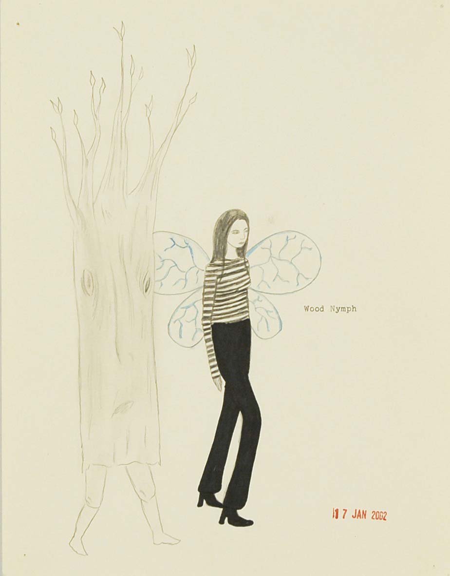 THE ROYAL ART LODGE 1996 Wood Nymph 2002 disegno-tecnica mista su carta 28x21,5 cm data e titolo in basso a destra firme e data al retro il gruppo The Royal Art Lodge si fonda in Canada nel 1996 ed è composto dai seguenti Artisti: Marcel Dzama, Neil Farber, Michael Dumontier, Hollie Dzama, Myles Langlois, Drue Langlois