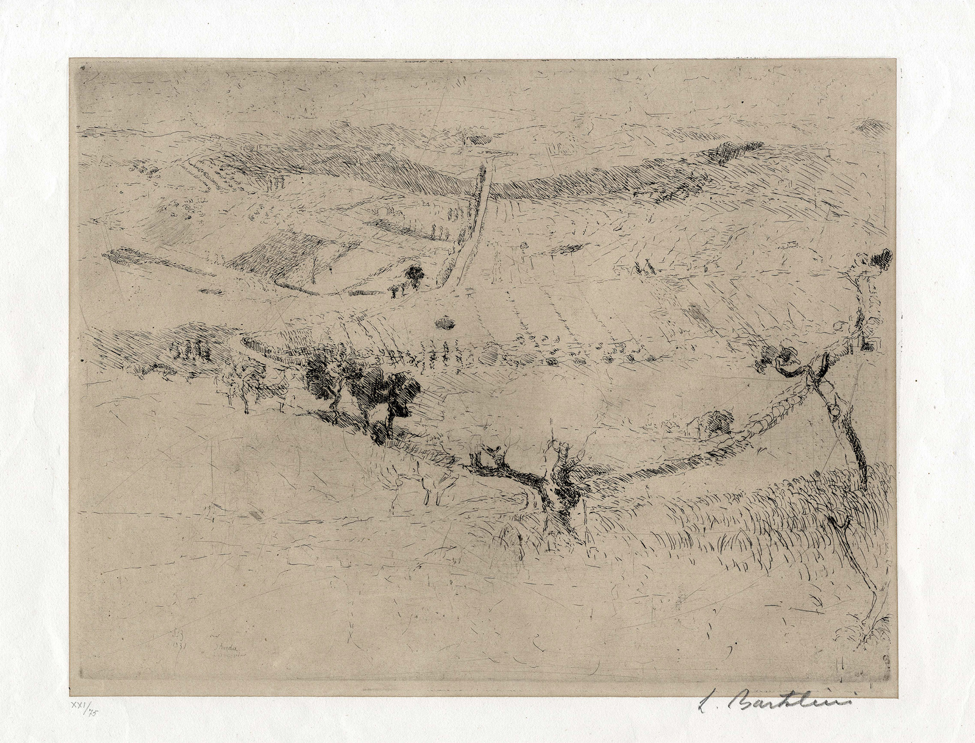 Acquaforte. mm 252x324. Foglio: mm 353x520. Sigla, data e titolo in lastra in basso a sinistra. Controfirma a matita in basso a destra e tiratura in basso a sinistra. Es. XXI/75. (1) Una gora d'acqua poco visibile all'angolo superiore sinistro e macchioline varie, sia al recto che al verso. Buona conservazione.