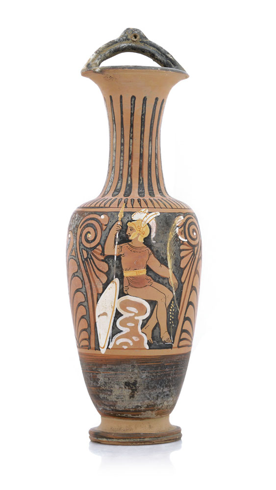 ANFORA NOLANA IN TERRACOTTA VERNICIATA A FIGURE ROSSE, IV SECOLO A.C., corpo ovoidale con alto collo cilindrico ad orlo svasato con ansa orizzontale applicata, decoro con guerriero e figura femminile entro riserve fitomorfe; usure.