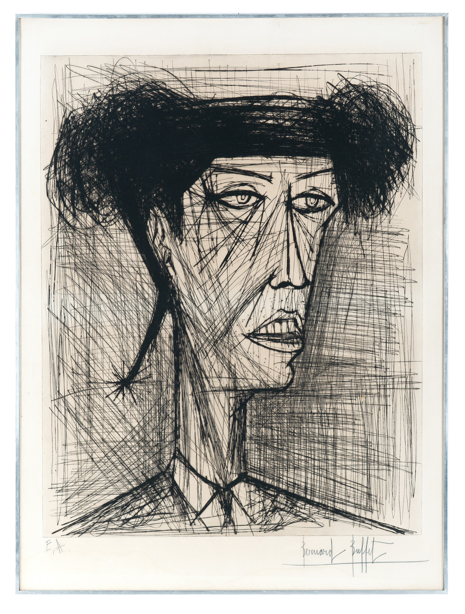 Acquaforte. mm 633x490. Foglio: mm 755x550. Firmata a matita in basso a destra, "E.A." a matita in basso a sinistra. Morsura ottima con inchiostrazione materica. Nello stesso anno Buffet riprende il soggetto variando la firma della bocca e dello zigomo, titolando l'incisione Torero II. (1) In sottile cornice metallica con vetro: cm 76,5x56,3. Trascurabili difetti lungo i margini. Ottima conservazione complessiva.