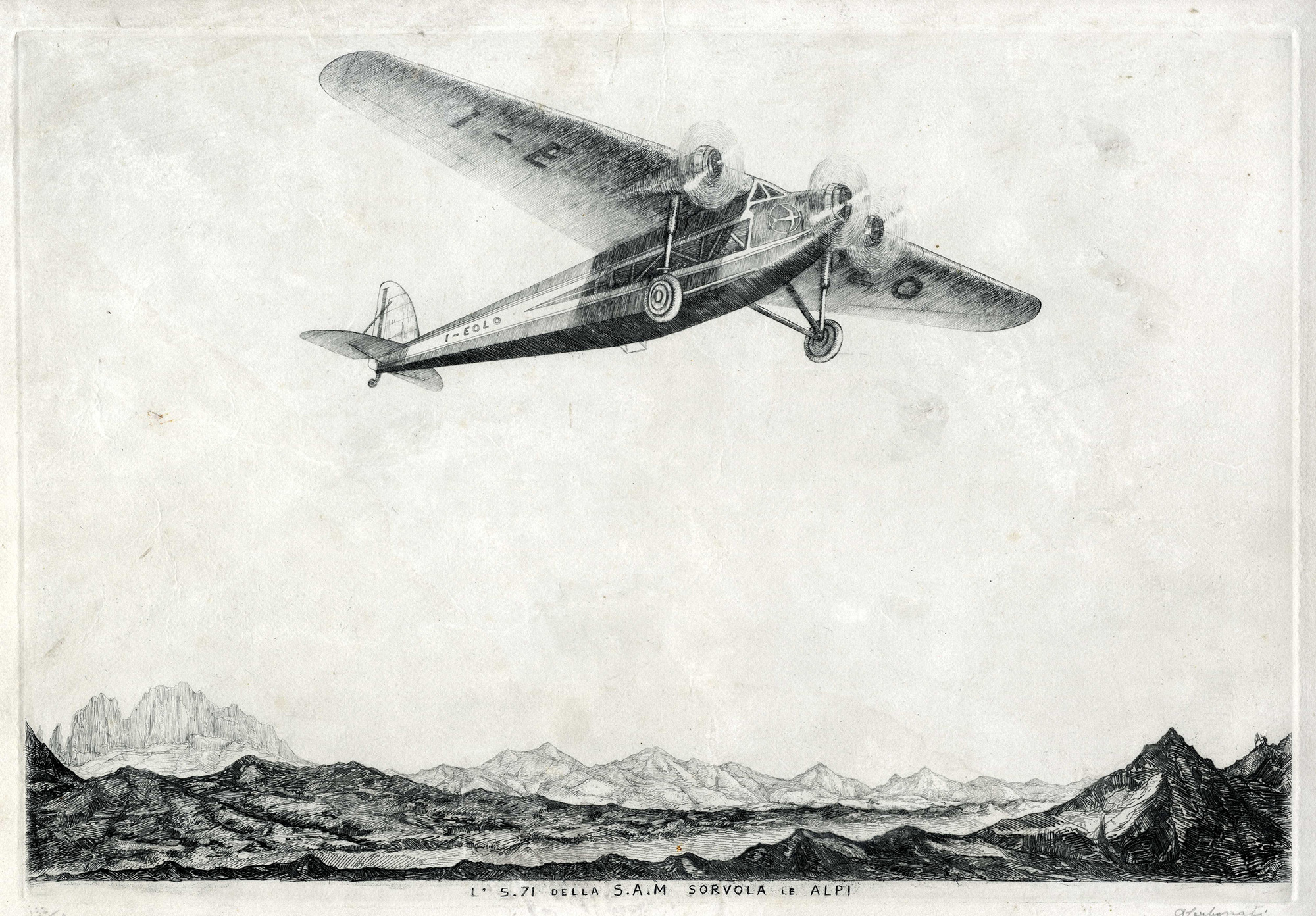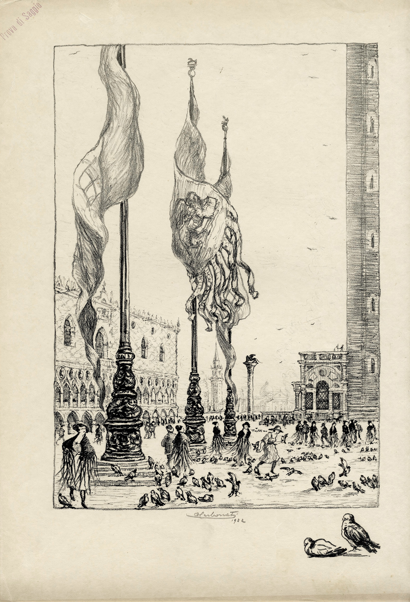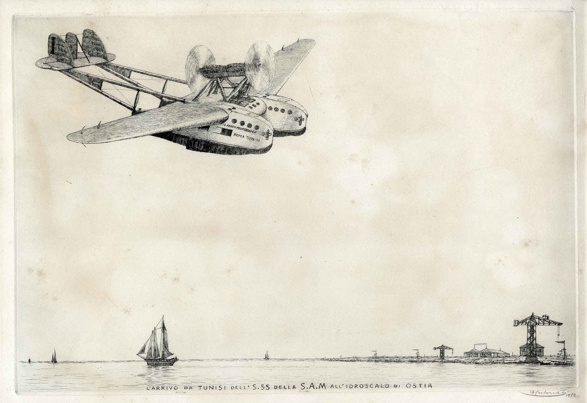 1-2) L'S.71 della S.A.M sorvola le Alpi e L'arrivo da Tunisi dell'S.55 della S.A.M all'Idroscalo di Ostia. 1932. Acquaforti. mm 280/285x410/412. Fogli: mm 325x451/502. Titoli nella lastra in basso al centro. Firma e data a matita per entrambe in basso a destra. Una delle due riporta la tiratura a matita in basso a sinistra, ovvero 132/200. 3-4-5) Venezia. 1922. Litografie. mm 330/370x230/240. Fogli: mm 435x310. Tutte con firma e data a matita in basso al centro. Due con tiratura a matita in basso a sinistra. Due con timbro a secco "GPA" in basso a sinistra e uno con timbro a inchiostro blu "Prova di saggio". Es.99/200 e 38/200. (5) OPERE 1-2) Varie screpolature della carta e uno dei fogli presenta un restauro al margine superiore. Macchioline e altri difetti. OPERE 3-4-5) Fogli leggermente bruniti e segni dei precedenti incollaggi a un foglio, altri minimi difetti.