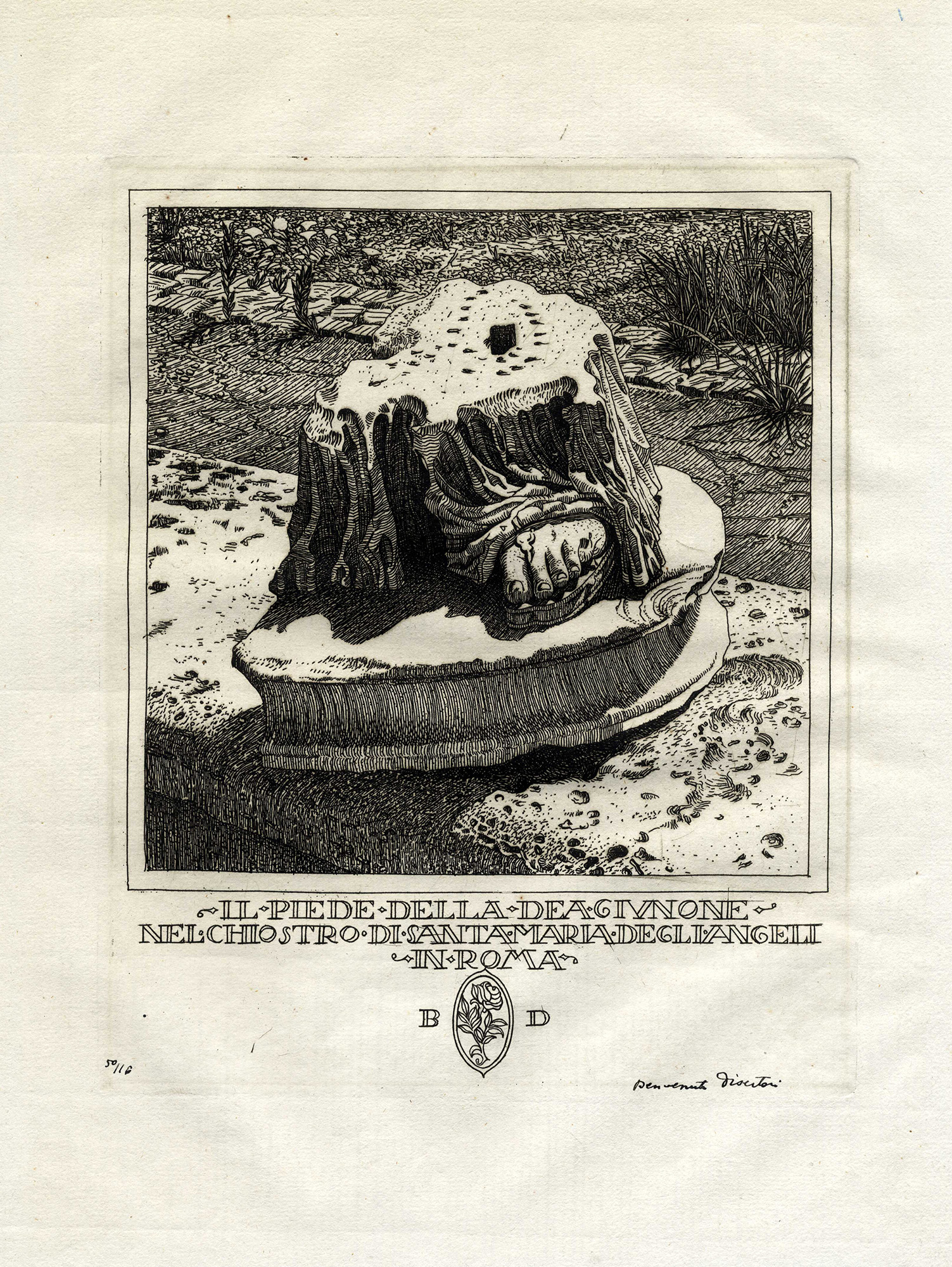 1) L'Arco di Tito. 1918. Acquaforte su carta vergellata. mm 285x225. Foglio: mm 385x305. Bellini-Alberti, 32. Firmata in lastra in basso a sinistra, controfirmata a china in basso a destra. Titolata a china in basso al centro. II stato. 2) Il piede della Dea Giunone nel Chiostro di Santa Maria degli Angeli in Roma. 1919-20. Acquaforte. mm 265x213. Foglio: mm 385x305. Bellini-Alberti, 37. Siglata in lastra in basso al centro. Firmata a china in basso a destra. (2) Minimi difetti. Ottima conservazione generale.
