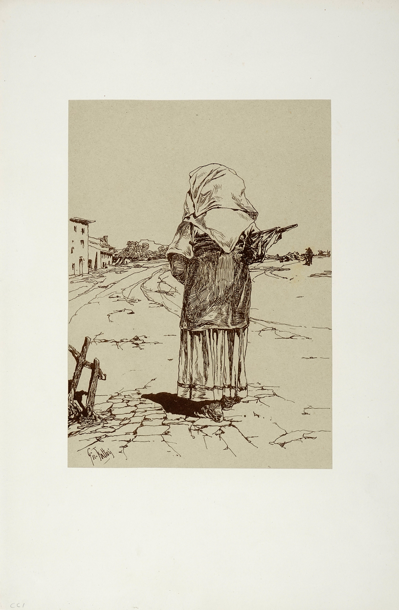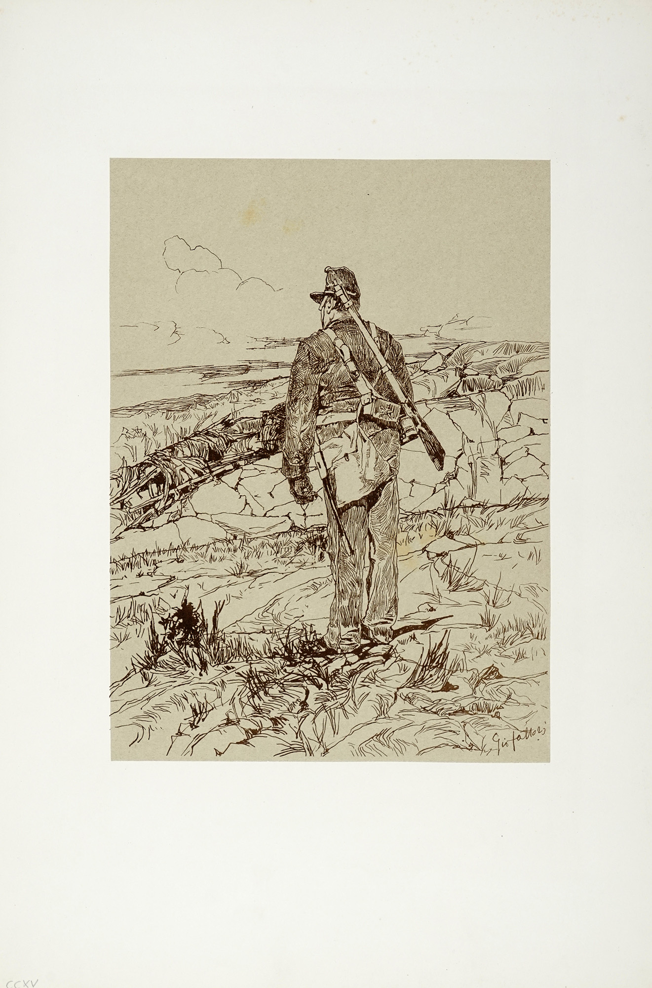 Album in foglio oblungo (mm 505x338) contenente 20 litografie stampate su fondo verde applicato a supporto di carta bianca liscia. Nel dettaglio: 1) Cavalleggeri in perlustrazione. mm 207x270. 2) Carica di cavalleria. mm 194x268. 3) In perlustrazione. mm 196x268. 4) Tre contadini in conversazione. mm 314x205. 5) Ciociara. mm 293x209. 6) Lanciere in vedetta. mm 193x257. 7) Barrocci romani. mm 204x250. 8) Il sergente. mm 268x198. 9) Alto d'artiglieria alle grandi manovre. mm 234x297. 10) Granatiere che impugna il fucile. mm 297x210. 11) Artigliere in vedetta. mm 210x146. 12) Traino d'artiglieria in discesa. mm 212x269. 13) Sentinella. mm 302x211. 14) Artiglieria in marcia. mm 201x255. 15) Governo dei cavalli. mm 216x272. 16) Pattuglia di cavalleggeri in perlustrazione. mm 190x267. 17) Paesaggio con buttero a cavallo e bove. mm 185x266. 18) Attendamento. mm 210x268. 19) Traino d'artiglieria in salita. mm 211x268. 20) Granatiere da tergo. mm 295x215. Tutte le litografie sono firmate in lastra. Malesci-Baboni, CCI-CCXX. Esemplare completo della cartella editoriale originale in carta verde con impressi al piatto anteriore titolo, fregi, autore, data e prezzo in oro. Bella e rara raccolta contenente l'opera litografica completa dell'artista in venti tavole, eseguite tra il 1883 e il 1884. La tiratura dei Venti ricordi dal vero è stata di pochissimi esemplari e due serie complete si trovano presso il Gabinetto Disegni e Stampe degli Uffizi; nel 1961 Aldo Gonnelli rintracciò 7 delle 20 pietre litografiche e ne fece una tiratura di 100 cartelle. Il segno è fluido e ben caratterizzato; così Mario Tinti: "La capacità lirica derivante dalla opposizione dei chiari e degli scuri che dagli anni eroici della "macchia" era stata dal Fattori sempre meno impiegata in pittura, nell'acquaforte ritorna a imporsi e a trionfare...". Cfr Mario Tinti, Giovanni Fattori (Roma-Milano, 1926). (1) Cartella editoriale con pieghe e strappi sparsi, restaurata al dorso con nastro in carta adesiva. Tavole interne con rare tracce di foxing sul foglio di supporto. Gli incisi su carta verde sono in ottimo stato conservativo.