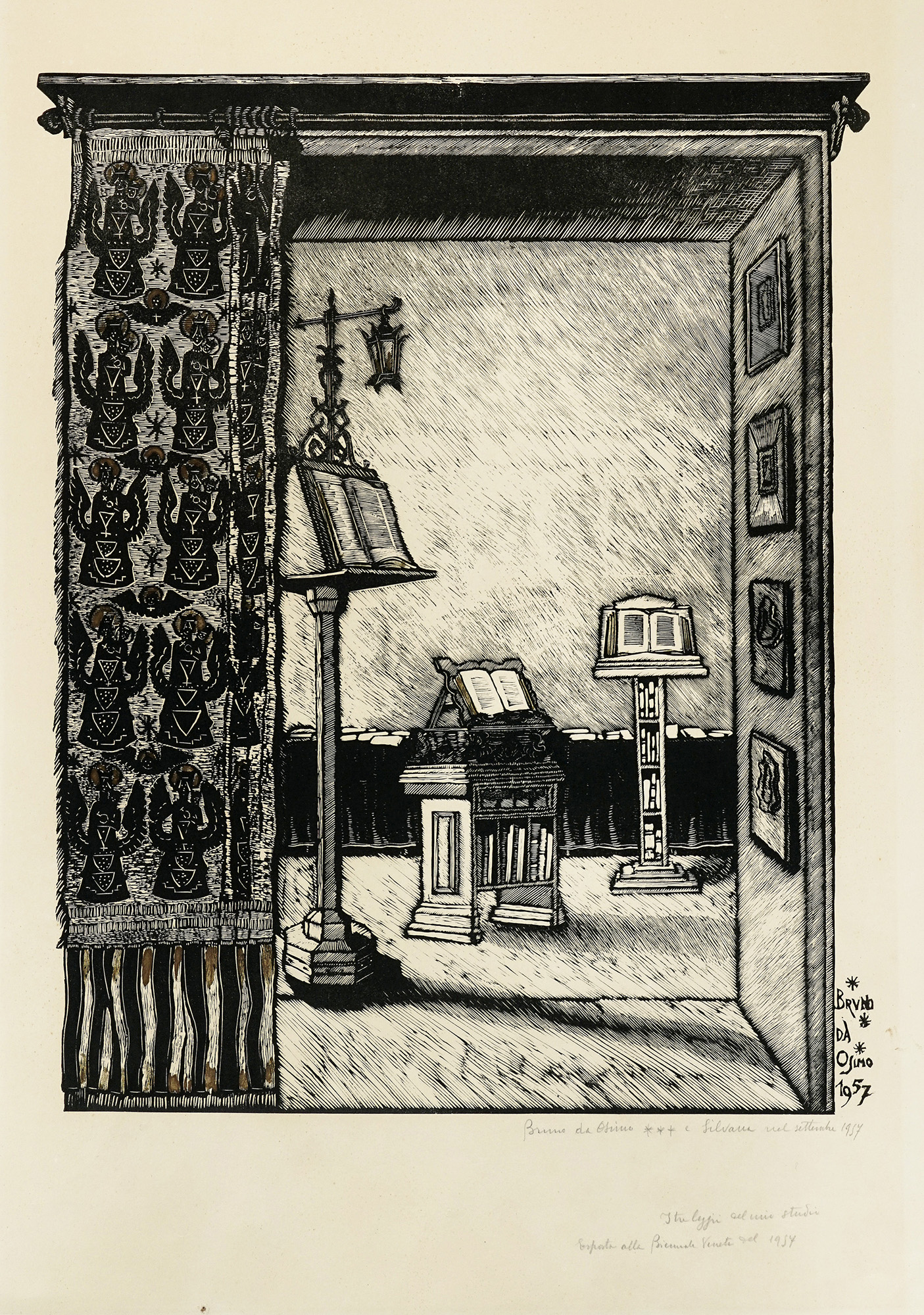 1) Stella Maris. 1932. Xilografia. mm 430x260. Foglio: mm 530x340. Firma e data in lastra in alto al centro. Controdatata a matita in basso a destra. Dedicata "A Romolo et Zelda Baltantoni offre da Casa Stella Maris lo Zio Bruno da Osimo con l'augurio di navigare verso il porto della felicità" a matita in basso a sinistra. 2) I tre leggii del mio studio. 1957. Xilografia con nobilitazioni oro. Firmata e datata in lastra in basso a destra, controfirmata e controdatata a matita in basso a destra. Titolo e "Esposto alla Biennale del1957" a matita in basso a destra. Biografia e appunti di collezione a matita sul verso. (2) OPERA 1: Strappetti marginali. Inciso in ottimo stato conservativo. OPERA 2: Lieve brunitura da esposizione. Ottimo stato conservativo.
