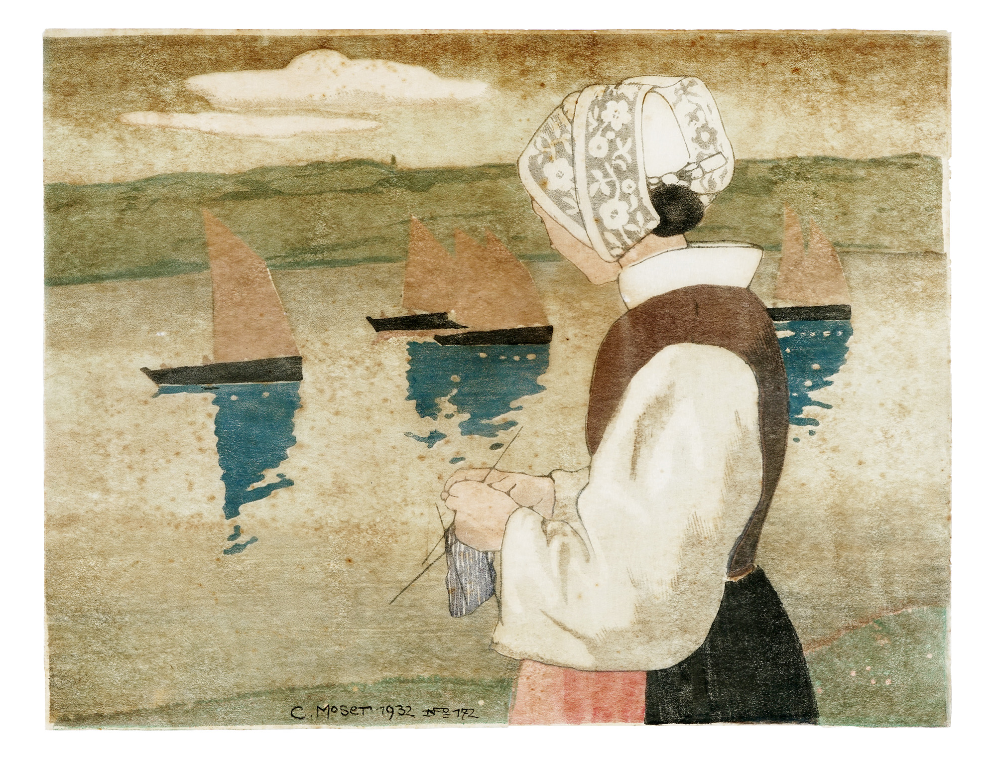 Xilografia a colori su sottilissima carta Cina. mm 375x490. Foglio: mm 380x495. Firmata, datata e numerata a china bruna in basso al centro. Esemplare nel IV o V stato, prima dell'aggiunta delle case sulle colline e comprensivo della cuffia decorata della donna. Le opere di Moser, sebbene provengano dagli stessi legni, hanno la peculiarità di essere numerate progressivamente senza limite di tiratura. Ogni ristampa varia campiture e colori, trasformando le xilografie in piccole opere uniche assestanti. Es. n° 172. (1) Foglio fragile e brunito uniformemente. Piccoli forellini, uno vicino alla vela sinistra, l'altro sul colletto dell'abito.